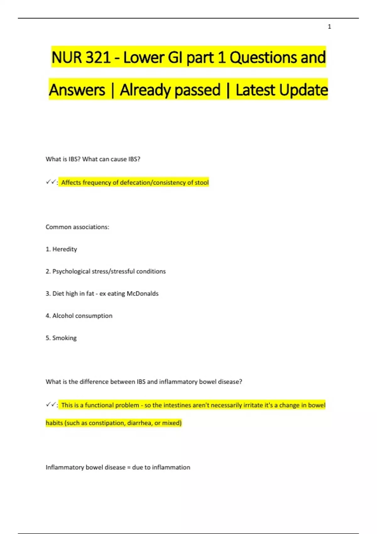 NUR 321 - Lower GI part 1 Questions and Answers | Already passed | Latest Update