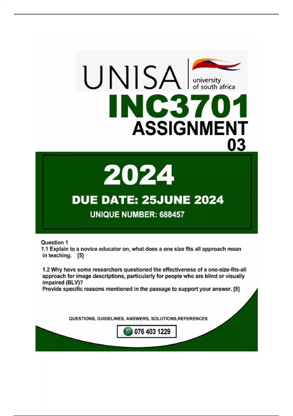 INC3701 ASSIGNMENT 03 DUE DATE: 25 JUNE 2024 UNIQUE NUMBER 688457 Question 1 1.1 Explain to a novice educator on, what does a one size fits all approach mean in teaching 1.2 Why have some researchers questioned the effectiveness of a one-size-fits-all approach for image descriptions, particularly for people who are blind or visually impaired (BLV)? Provide specific reasons mentioned in the passage to support your answer. [5]