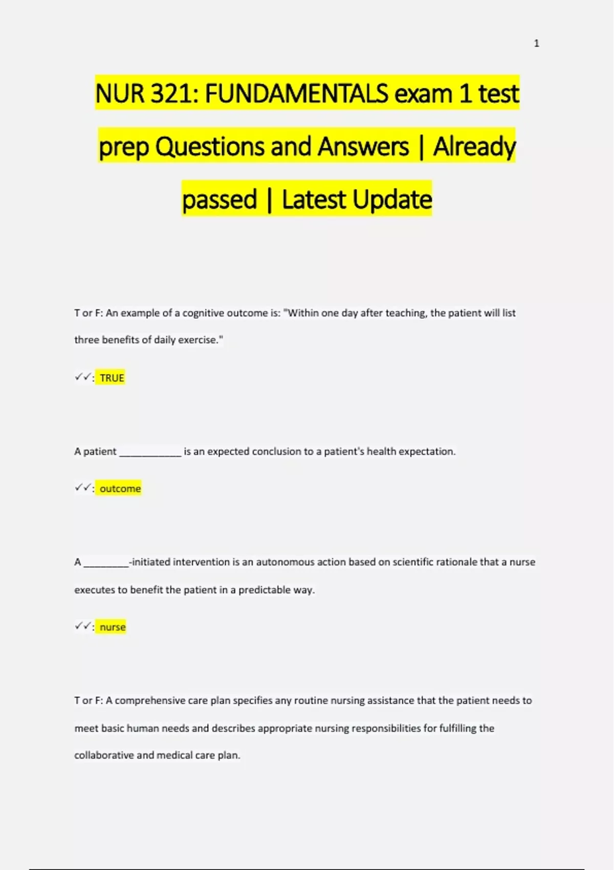 NUR 321: FUNDAMENTALS exam 1 test prep Questions and Answers | Already passed | Latest Update