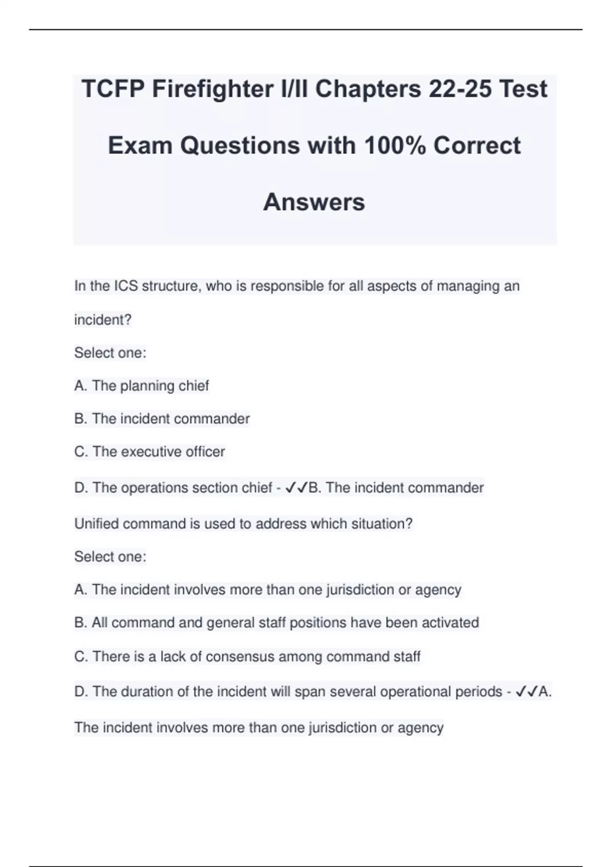 TCFP Firefighter I/II Chapters 22-25 Test Exam Questions with 100% Correct Answers In the ICS structure, who is responsible for all aspects of managing an incident? Select one: A. The planning chief B. The incident commander C. The executive officer D. The operations section chief - B. The incident commander Unified command is used to address which situation? Select one: A. The incident involves more than one jurisdiction or agency B. All command and general staff positions have been activated C. There is a lack of consensus among command staff D. The duration of the incident will span several operational periods - A. The incident involves more than one jurisdiction or agency What is the ICS organizational title for a member of the general staff? Select one: A. Director B. Chief C. Officer D. Manager - B. Chief What is the title for the individual in charge of a company? Select one: A. Squad leader B. Company officer C. Sector manager D. Resource director - B. Company officer Where should the command post be located? Select one: A. On either front corner of the building B. Adjacent to the incident perimeter C. In a nearby, protected location D. At the forward observation limit - C. In a nearby, protected location Which ICS section is responsible for providing needed services and supplies?