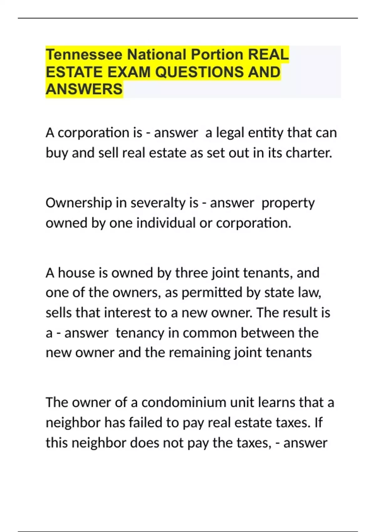 Tennessee National Portion REAL ESTATE EXAM QUESTIONS AND ANSWERS