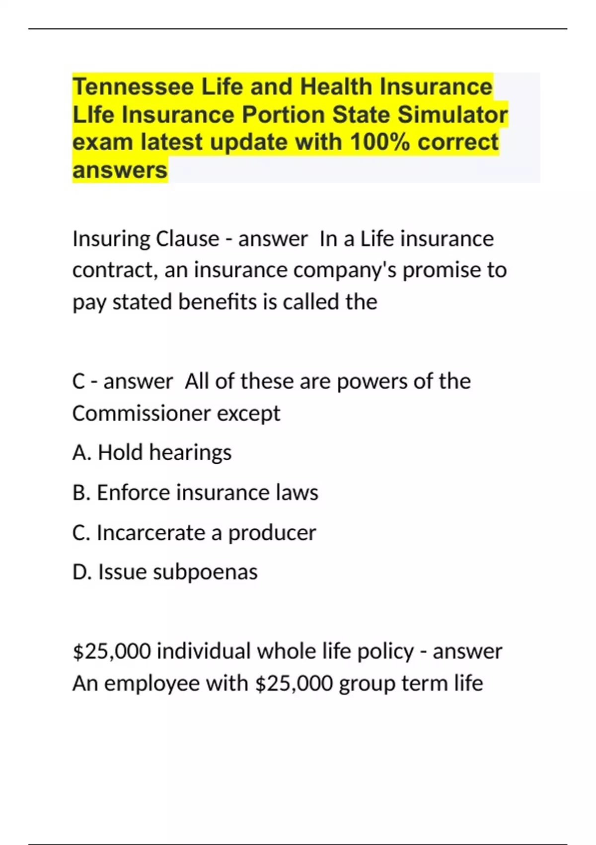 Tennessee Life and Health Insurance LIfe Insurance Portion State Simulator exam latest update with 100% correct answers