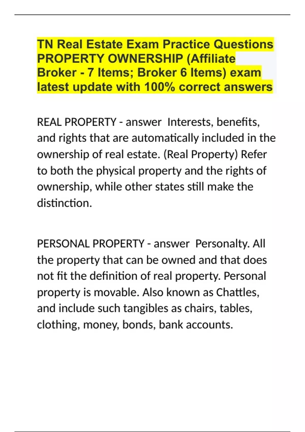 TN Real Estate Exam Practice Questions PROPERTY OWNERSHIP (Affiliate Broker - 7 Items; Broker 6 Items) exam latest update with 100% correct answers