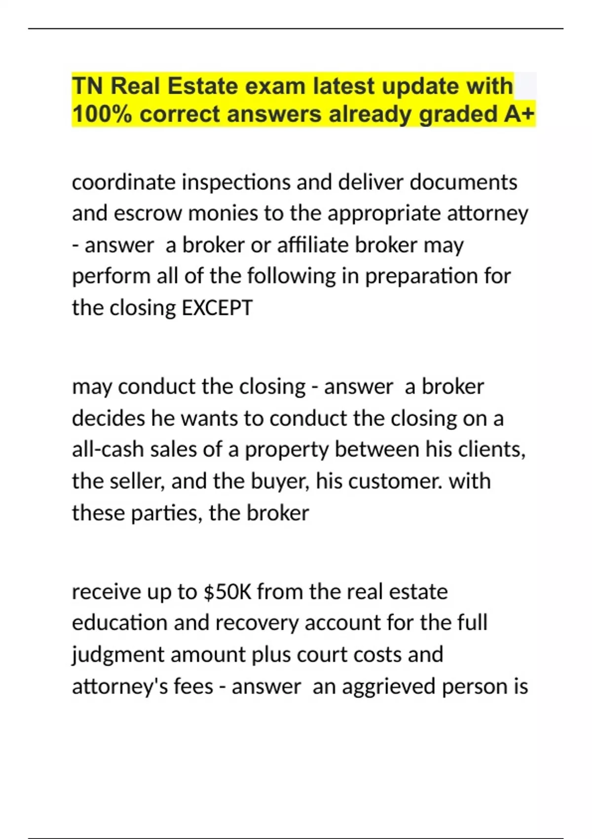 TN Real Estate exam latest update with 100% correct answers already graded A+