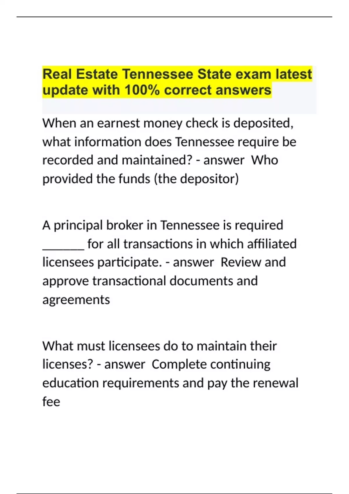 Real Estate Tennessee State exam latest update with 100% correct answers.