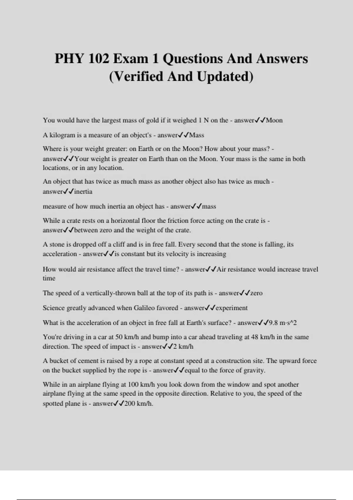 PHY 102 Exam 1 Questions And Answers (Verified And Updated) You would have the largest mass of gold if it weighed 1 N on the - answerMoon A kilogram is a measure of an object's - answerMass Where is your weight greater: on Earth or on the Moon? How about your mass? - answerYour weight is greater on Earth than on the Moon. Your mass is the same in both locations, or in any location. An object that has twice as much mass as another object also has twice as much - answerinertia measure of how much inertia an object has - answermass While a crate rests on a horizontal floor the friction force acting on the crate is - answerbetween zero and the weight of the crate. A stone is dropped off a cliff and is in free fall. Every second that the stone is falling, its acceleration - answeris constant but its velocity is increasing How would air resistance affect the travel time? - answerAir resistance would increase travel time The speed of a vertically-thrown ball at the top of its path is - answerzero Science greatly advanced when Galileo favored - answerexperiment What is the acceleration of an object in free fall at Earth's surface? - answer9.8 m⋅s^2 You're driving in a car at 50 km/h and bump into a car ahead traveling at 48 km/h in the same direction. The speed of impact is - answer2 km/h A bucket of cement is raised by a rope at constant speed at a construction site. The upward force on the bucket supplied by the rope is - answerequal to the force of gravity. While in an airplane flying at 100 km/h you look down from the window and spot another airplane flying at the same speed in the opposite direction. Relative to you, the speed of the spotted plane is - answer200 km/h.