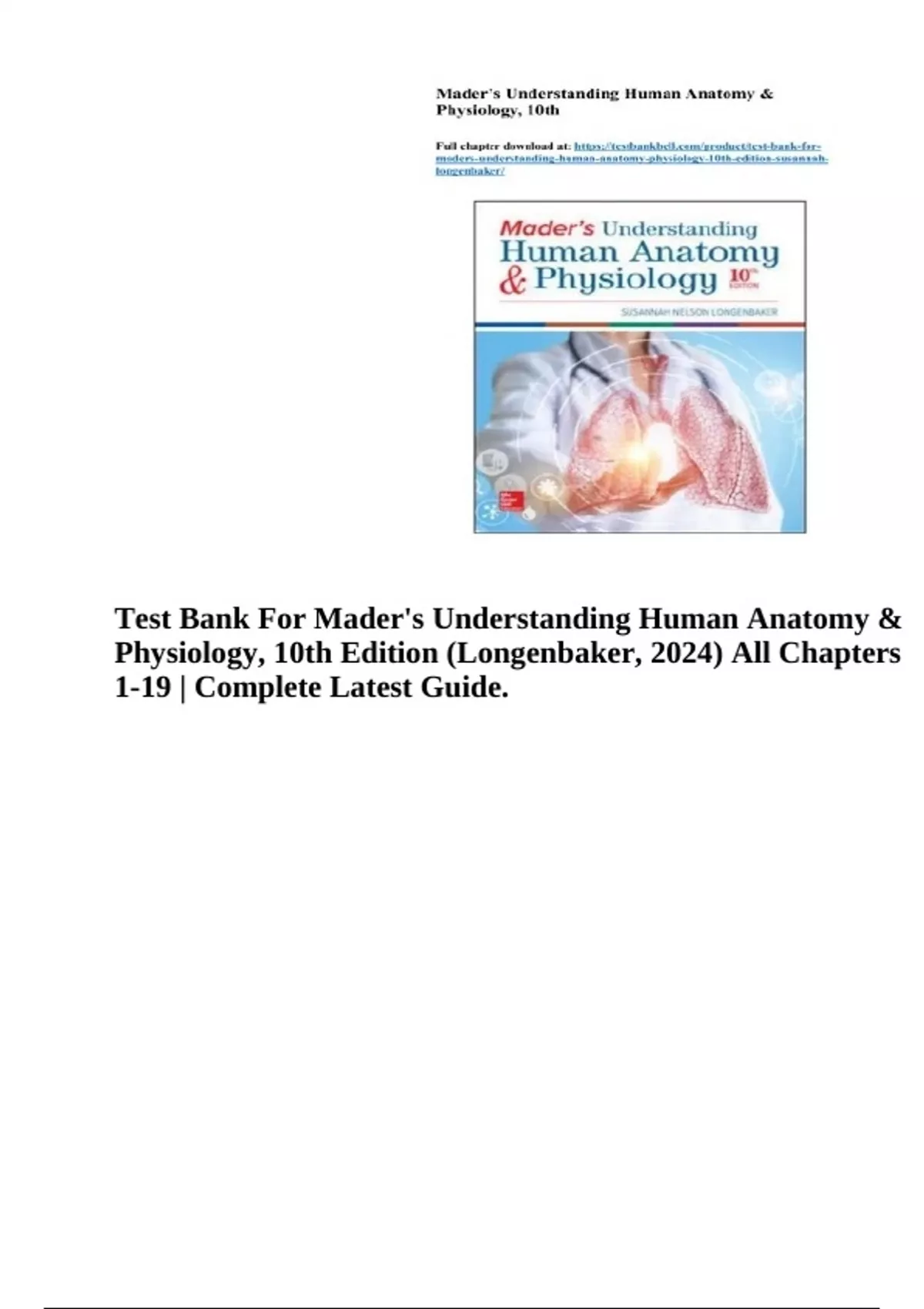 Test Bank For Mader's Understanding Human Anatomy & Physiology, 10th Edition (Longenbaker, 2024) All Chapters 1-19 | Complete Latest Guide.