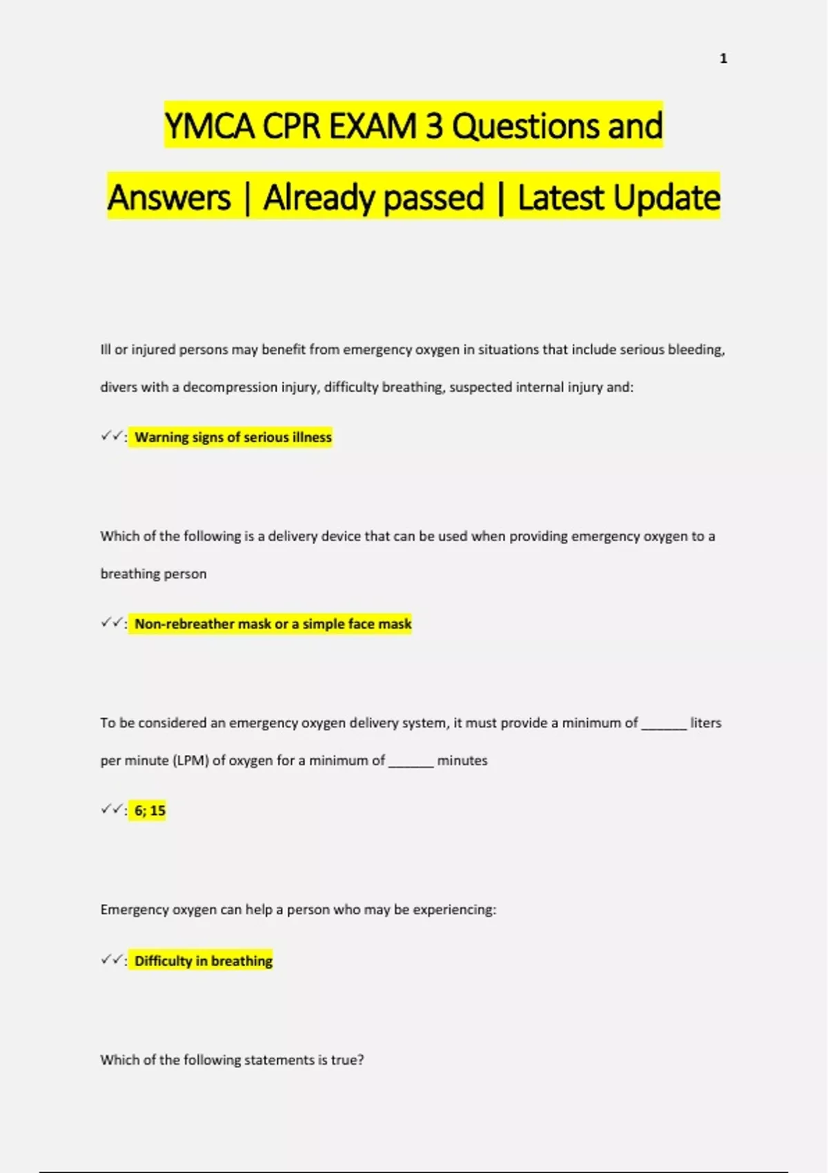 ymca cpr exam 3 questions and answers already p