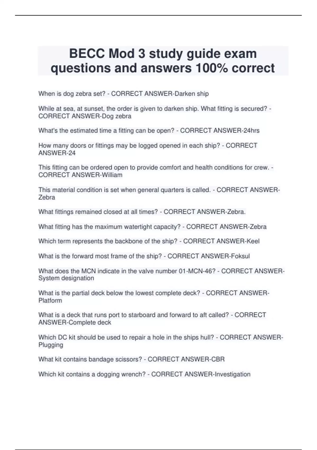 BECC Mod 3 study guide exam questions and answers 100% correct When is dog zebra set? - CORRECT ANSWER-Darken ship While at sea, at sunset, the order is given to darken ship. What fitting is secured? - CORRECT ANSWER-Dog zebra What's the estimated time a fitting can be open? - CORRECT ANSWER-24hrs How many doors or fittings may be logged opened in each ship? - CORRECT ANSWER-24 This fitting can be ordered open to provide comfort and health conditions for crew. - CORRECT ANSWER-William This material condition is set when general quarters is called. - CORRECT ANSWERZebra What fittings remained closed at all times? - CORRECT ANSWER-Zebra. What fitting has the maximum watertight capacity? - CORRECT ANSWER-Zebra Which term represents the backbone of the ship? - CORRECT ANSWER-Keel What is the forward most frame of the ship? - CORRECT ANSWER-Foksul What does the MCN indicate in the valve number 01-MCN-46? - CORRECT ANSWERSystem designation What is the partial deck below the lowest complete deck? - CORRECT ANSWERPlatform What is a deck that runs port to starboard and forward to aft called? - CORRECT ANSWER-Complete deck Which DC kit should be used to repair a hole in the ships hull? - CORRECT ANSWERPlugging What kit contains bandage scissors? - CORRECT ANSWER-CBR