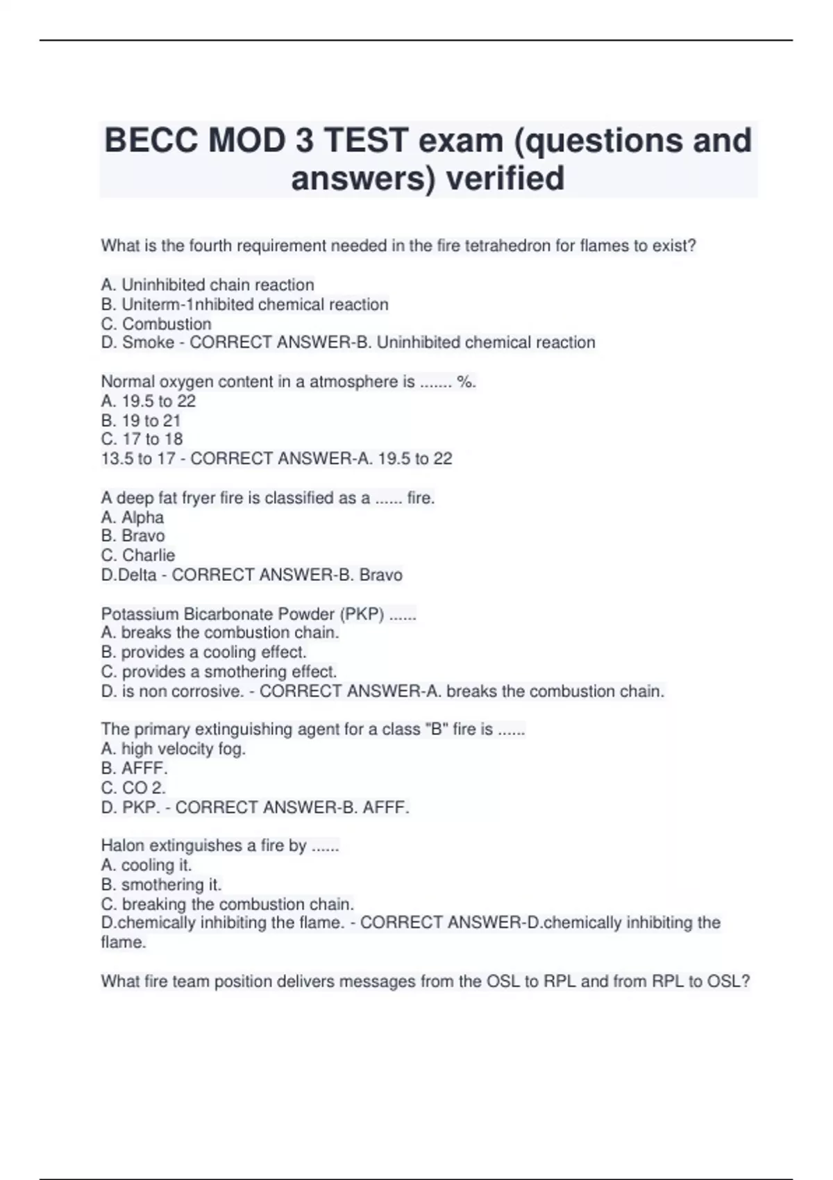 BECC MOD 3 TEST exam (questions and answers) verified What is the fourth requirement needed in the fire tetrahedron for flames to exist? A. Uninhibited chain reaction B. Uniterm-1nhibited chemical reaction C. Combustion D. Smoke - CORRECT ANSWER-B. Uninhibited chemical reaction Normal oxygen content in a atmosphere is ....... %. A. 19.5 to 22 B. 19 to 21 C. 17 to 18 13.5 to 17 - CORRECT ANSWER-A. 19.5 to 22 A deep fat fryer fire is classified as a ...... fire. A. Alpha B. Bravo C. Charlie D.Delta - CORRECT ANSWER-B. Bravo Potassium Bicarbonate Powder (PKP) ...... A. breaks the combustion chain. B. provides a cooling effect. C. provides a smothering effect. D. is non corrosive. - CORRECT ANSWER-A. breaks the combustion chain. The primary extinguishing agent for a class "B" fire is ...... A. high velocity fog. B. AFFF. C. CO 2. D. PKP. - CORRECT ANSWER-B. AFFF. Halon extinguishes a fire by ...... A. cooling it. B. smothering it. C. breaking the combustion chain. D.chemically inhibiting the flame. - CORRECT ANSWER-D.chemically inhibiting the flame. What fire team position delivers messages from the OSL to RPL and from RPL to OSL