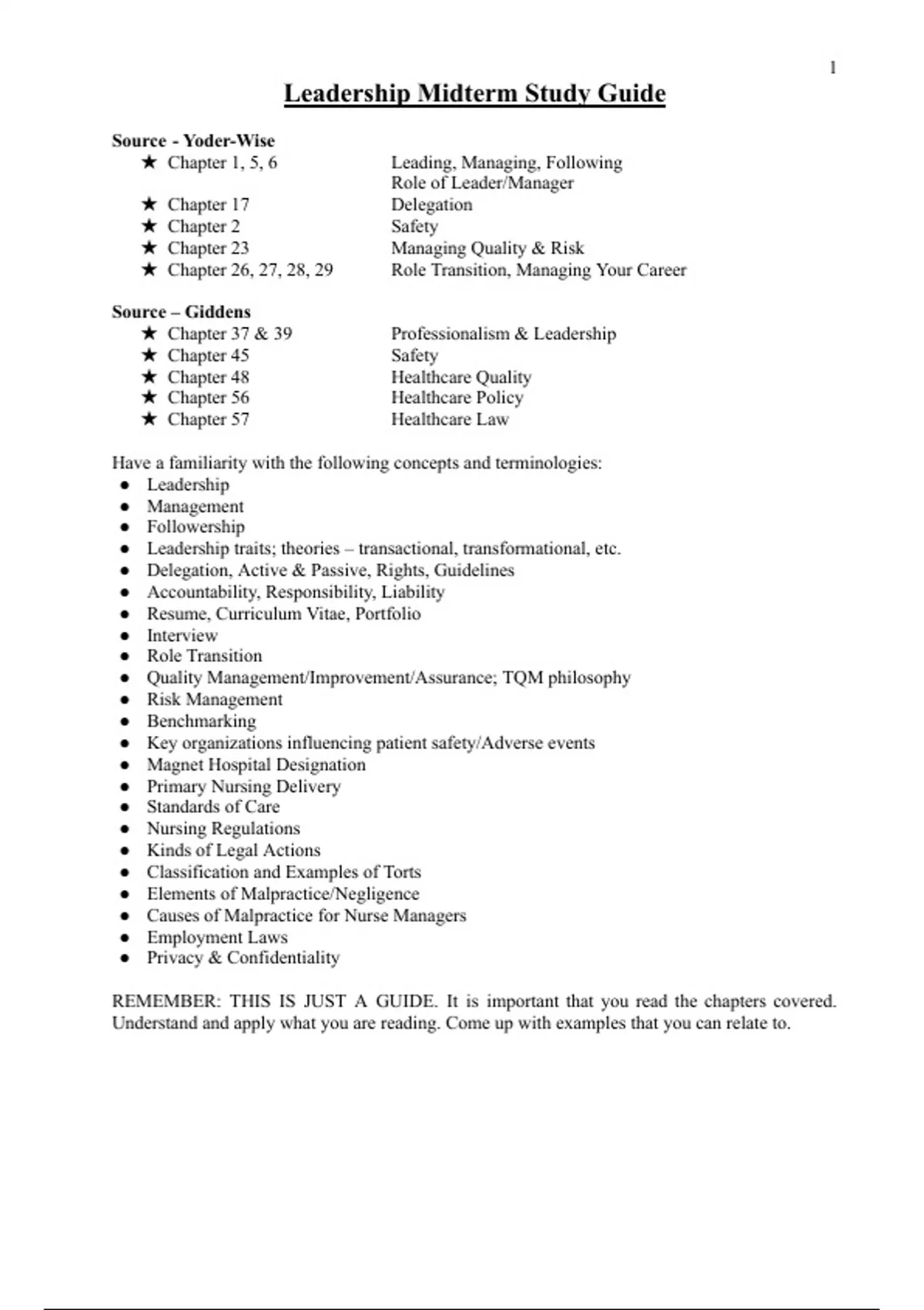 Leadership Midterm Study notes (NUR 4305)