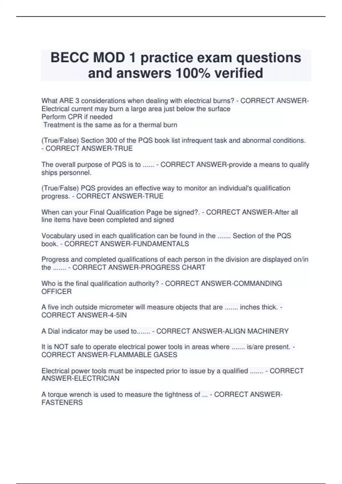 BECC MOD 1 practice exam questions and answers 100% verified What ARE 3 considerations when dealing with electrical burns? - CORRECT ANSWERElectrical current may burn a large area just below the surface Perform CPR if needed Treatment is the same as for a thermal burn (True/False) Section 300 of the PQS book list infrequent task and abnormal conditions. - CORRECT ANSWER-TRUE The overall purpose of PQS is to ...... - CORRECT ANSWER-provide a means to qualify ships personnel. (True/False) PQS provides an effective way to monitor an individual's qualification progress. - CORRECT ANSWER-TRUE When can your Final Qualification Page be signed?. - CORRECT ANSWER-After all line items have been completed and signed Vocabulary used in each qualification can be found in the ....... Section of the PQS book. - CORRECT ANSWER-FUNDAMENTALS Progress and completed qualifications of each person in the division are displayed on/in the ....... - CORRECT ANSWER-PROGRESS CHART