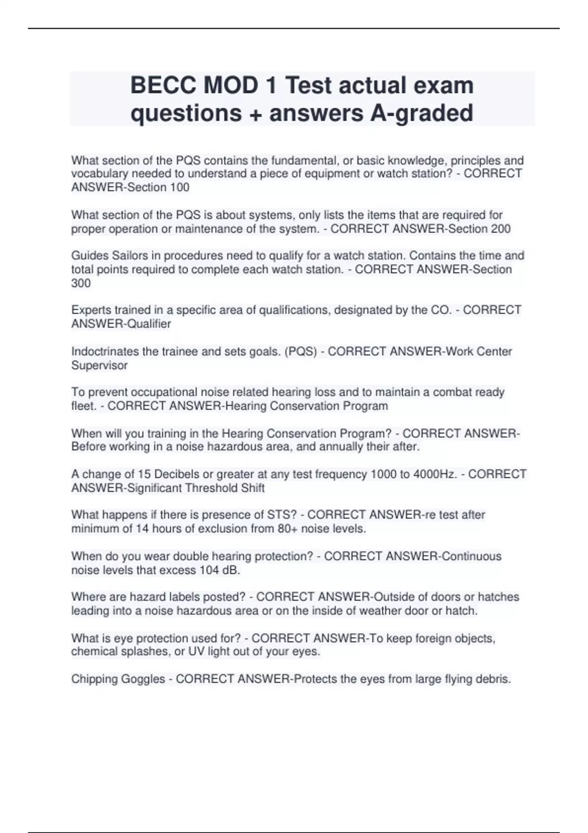 BECC MOD 1 Test actual exam questions + answers A-graded What section of the PQS contains the fundamental, or basic knowledge, principles and vocabulary needed to understand a piece of equipment or watch station? - CORRECT ANSWER-Section 100 What section of the PQS is about systems, only lists the items that are required for proper operation or maintenance of the system. - CORRECT ANSWER-Section 200 Guides Sailors in procedures need to qualify for a watch station. Contains the time and total points required to complete each watch station. - CORRECT ANSWER-Section 300 Experts trained in a specific area of qualifications, designated by the CO. - CORRECT ANSWER-Qualifie