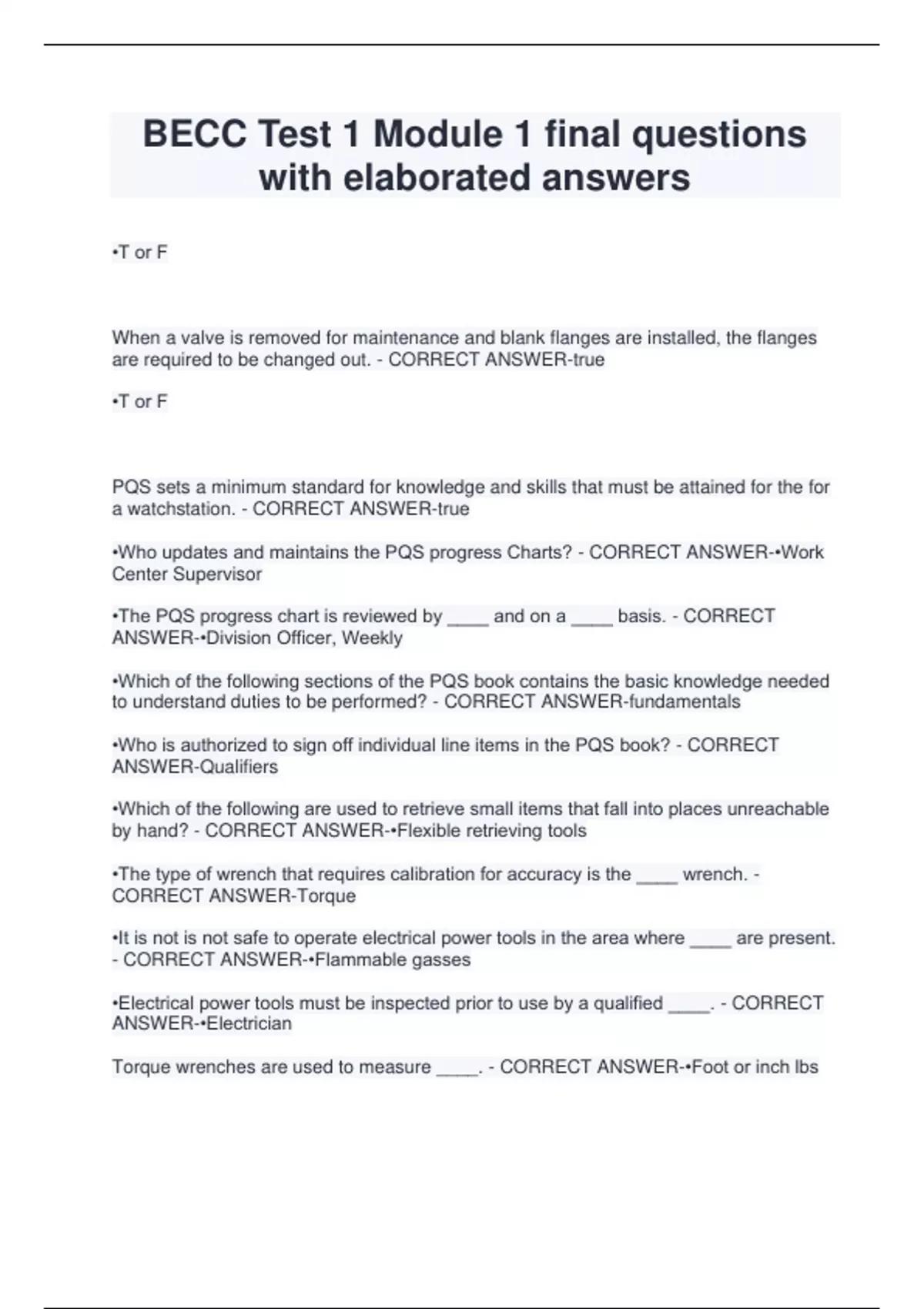 BECC Test 1 Module 1 final questions with elaborated answers •T or F When a valve is removed for maintenance and blank flanges are installed, the flanges are required to be changed out. - CORRECT ANSWER-true •T or F PQS sets a minimum standard for knowledge and skills that must be attained for the for a watchstation. - CORRECT ANSWER-true •Who updates and maintains the PQS progress Charts? - CORRECT ANSWER-•Work Center Supervisor •The PQS progress chart is reviewed by ____ and on a ____ basis. - CORRECT ANSWER-•Division Officer, Weekly •Which of the following sections of the PQS book contains the basic knowledge needed to understand duties to be performed? - CORRECT ANSWER-fundamentals •Who is authorized to sign off individual line items in the PQS book? - CORRECT ANSWER-Qualifiers •Which of the following are used to retrieve small items that fall into places unreachable by hand? - CORRECT ANSWER-•Flexible retrieving tools