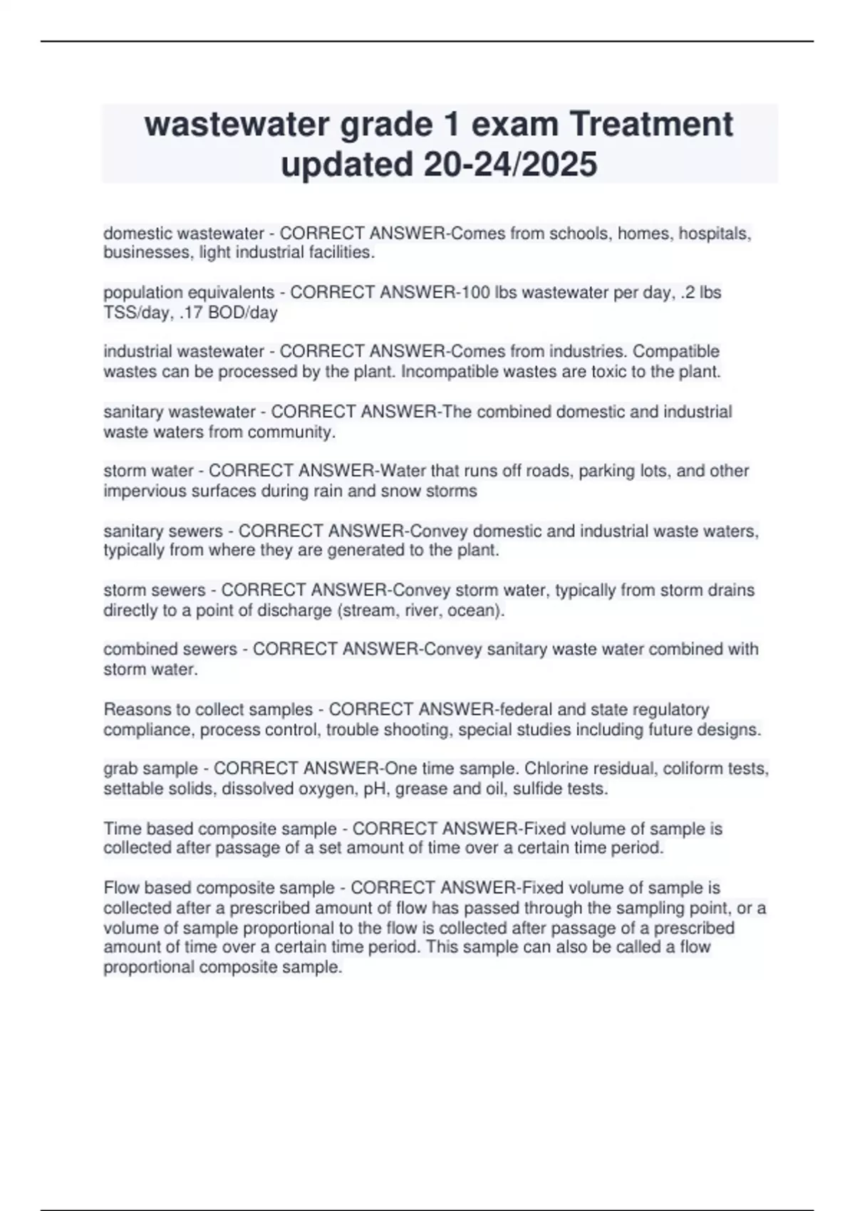 wastewater grade 1 exam Treatment updated 20-24/2025 domestic wastewater - CORRECT ANSWER-Comes from schools, homes, hospitals, businesses, light industrial facilities. population equivalents - CORRECT ANSWER-100 lbs wastewater per day, .2 lbs TSS/day, .17 BOD/day industrial wastewater - CORRECT ANSWER-Comes from industries. Compatible wastes can be processed by the plant. Incompatible wastes are toxic to the plant. sanitary wastewater - CORRECT ANSWER-The combined domestic and industrial waste waters from community. storm water - CORRECT ANSWER-Water that runs off roads, parking lots, and other impervious surfaces during rain and snow storms sanitary sewers - CORRECT ANSWER-Convey domestic and industrial waste waters, typically from where they are generated to the plant. storm sewers - CORRECT ANSWER-Convey storm water, typically from storm drains directly to a point of discharge (stream, river, ocean). combined sewers - CORRECT ANSWER-Convey sanitary waste water combined with storm water. Reasons to collect samples - CORRECT ANSWER-federal and state regulatory compliance, process control, trouble shooting, special studies including future designs. grab sample - CORRECT ANSWER-One time sample. Chlorine residual, coliform tests, settable solids, dissolved oxygen, pH, grease and oil, sulfide tests. Time based composite sample - CORRECT ANSWER-Fixed volume of sample is collected after passage of a set amount of time over a certain time period. Flow based composite sample - CORRECT ANSWER-Fixed volume of sample is collected after a prescribed amount of flow has passed through the sampling point, or a volume of sample proportional to the flow is collected after passage of a prescribed amount of time over a certain time period. This sample can also be called a flow proportional composite sample. diurnal flow - CORRECT ANSWER-Low at night between 2 and 5 am, steady steep increase in flow starting after 5 am, reaching first peak in the late morning or early afternoon, slight decrease through the afternoon, second peak between 6 and 9 pm, and a tapering off of to the low flows of 2 a