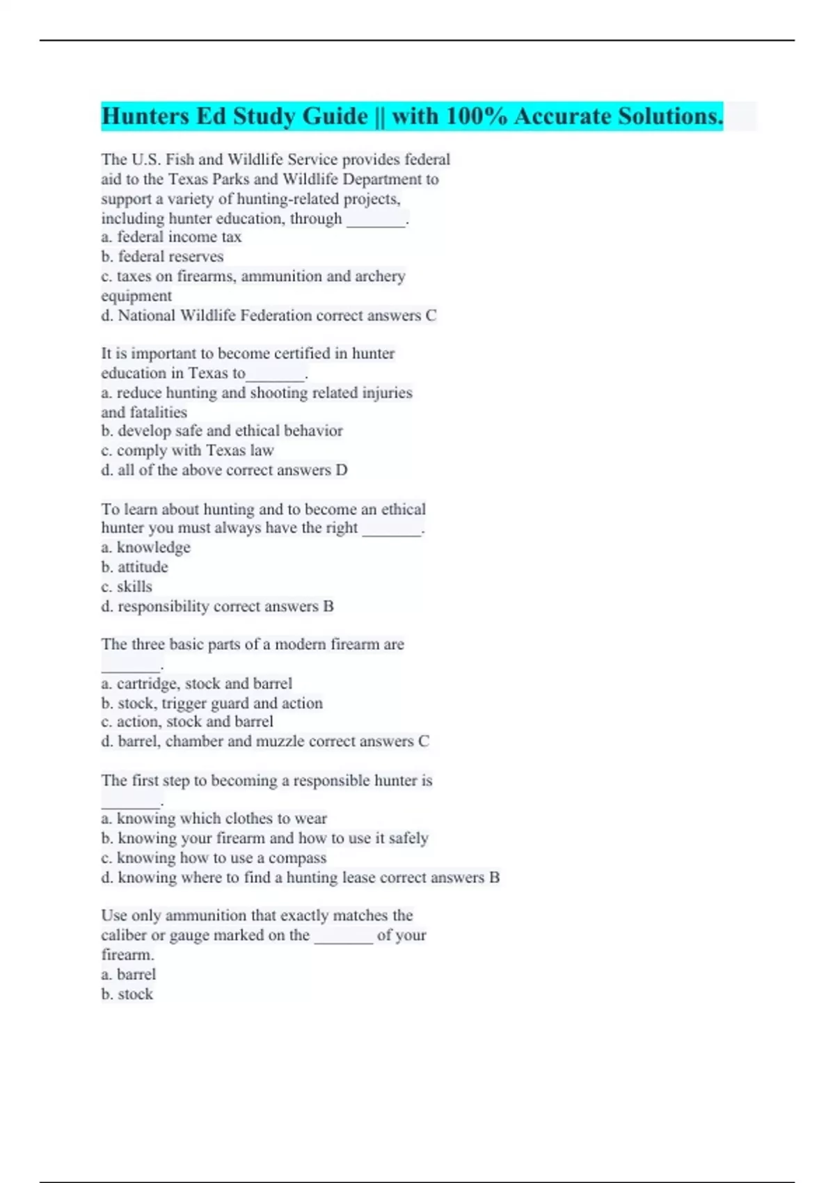 The U.S. Fish and Wildlife Service provides federal aid to the Texas Parks and Wildlife Department to support a variety of hunting-related projects, including hunter education, through _______. a. federal income tax b. federal reserves c. taxes on firearms, ammunition and archery equipment d. National Wildlife Federation correct answers C It is important to become certified in hunter education in Texas to_______. a. reduce hunting and shooting related injuries and fatalities b. develop safe and ethical behavior c. comply with Texas law d. all of the above correct answers D To learn about hunting and to become an ethical hunter you must always have the right _______. a. knowledge b. attitude c. skills d. responsibility correct answers B The three basic parts of a modern firearm are _______. a. cartridge, stock and barrel b. stock, trigger guard and action c. action, stock and barrel d. barrel, chamber and muzzle correct answers C The first step to becoming a responsible hunter is _______. a. knowing which clothes to wear b. knowing your firearm and how to use it safely c. knowing how to use a compass d. knowing where to find a hunting lease correct answers B Use only ammunition that exactly matches the caliber or gauge marked on the _______ of your firearm. a. barrel b. stock