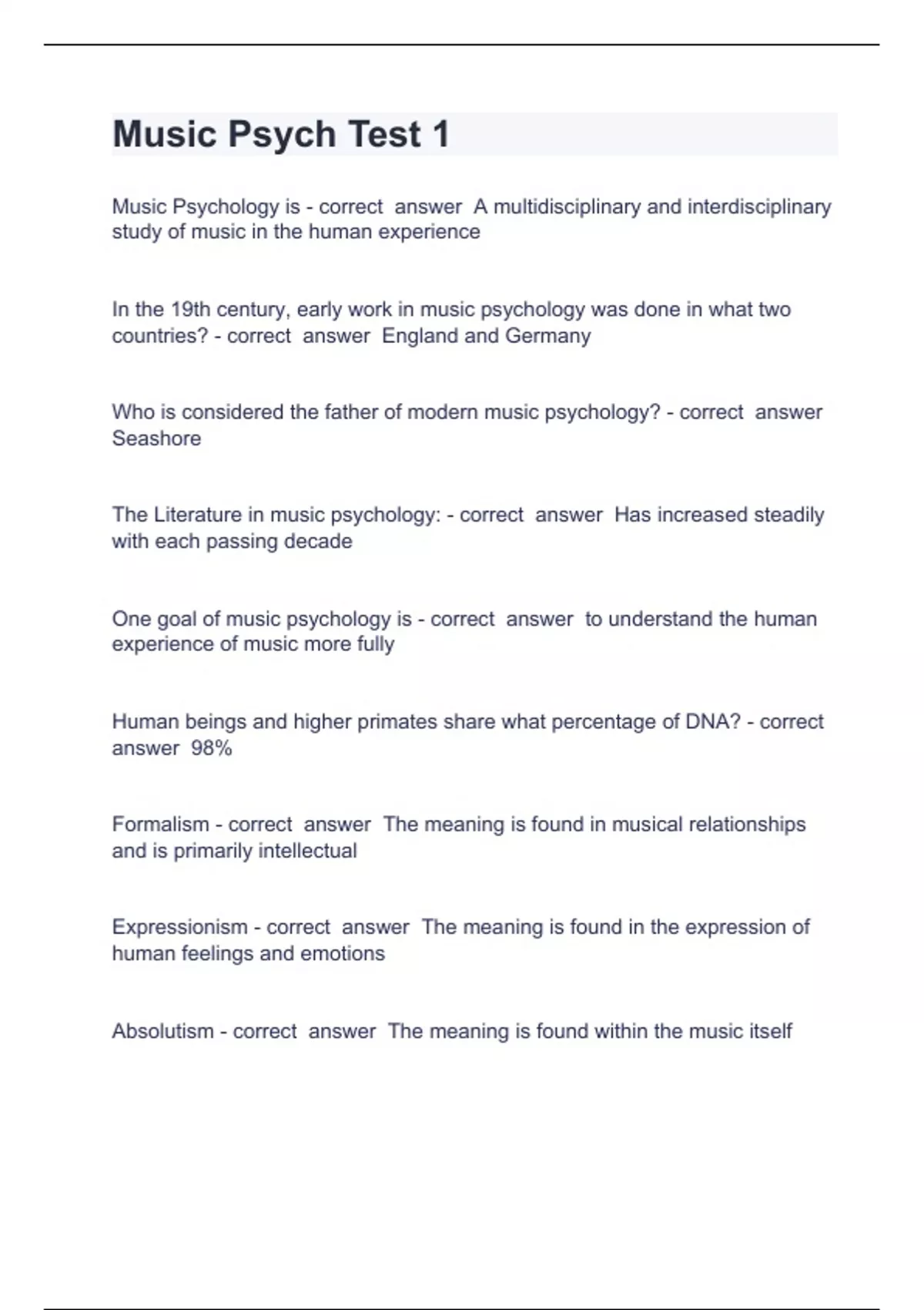 Music Psych Test 1 Question and answers rated A+ Music Psych Test 1 Music Psychology is - correct answer A multidisciplinary and interdisciplinary study of music in the human experience In the 19th century, early work in music psychology was done in what two countries? - correct answer England and Germany Who is considered the father of modern music psychology? - correct answer Seashore The Literature in music psychology: - correct answer Has increased steadily with each passing decade One goal of music psychology is - correct answer to understand the human experience of music more fully Human beings and higher primates share what percentage of DNA? - correct answer 98%