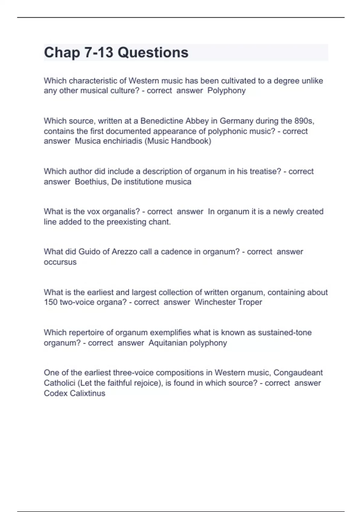 Chap 7 Question and answers rated A+Chap 7-13 Questions Which characteristic of Western music has been cultivated to a degree unlike any other musical culture? - correct answer Polyphony Which source, written at a Benedictine Abbey in Germany during the 890s, contains the first documented appearance of polyphonic music? - correct answer Musica enchiriadis (Music Handbook) Which author did include a description of organum in his treatise? - correct answer Boethius, De institutione musica What is the vox organalis? - correct answer In organum it is a newly created line added to the preexisting chant. What did Guido of Arezzo call a cadence in organum? - correct answer occursus What is the earliest and largest collection of written organum, containing about 150 two-voice organa? - correct answer Winchester Troper Which repertoire of org