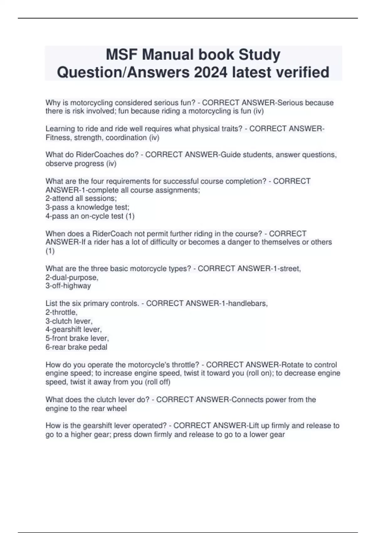 MSF Manual book Study Question/Answers 2024 latest verified Why is motorcycling considered serious fun? - CORRECT ANSWER-Serious because there is risk involved; fun because riding a motorcycling is fun (iv) Learning to ride and ride well requires what physical traits? - CORRECT ANSWERFitness, strength, coordination (iv) What do RiderCoaches do? - CORRECT ANSWER-Guide students, answer questions, observe progress (iv) What are the four requirements for successful course completion? - CORRECT ANSWER-1-complete all course assignments; 2-attend all sessions; 3-pass a knowledge test; 4-pass an on-cycle test (1) When does a RiderCoach not permit further riding in the course? - CORRECT ANSWER-If a rider has a lot of difficulty or becomes a danger to themselves or others (1) What are the three basic motorcycle types? - CORRECT ANSWER-1-street, 2-dual-purpose, 3-off-highway List the six primary controls. - CORRECT ANSWER-1-handlebars, 2-throttle, 3-clutch lever, 4-gearshift lever, 5-front brake lever, 6-rear brake pedal How do you operate the motorcycle's throttle? - CORRECT ANSWER-Rotate to control engine speed; to increase engine speed, twist it toward you (roll on); to decrease engine speed, twist it away from you (roll off) What does the clutch lever do? - CORRECT ANSWER-Connects power from the engine to the rear wheel How is the gearshift lever operated? - CORRECT ANSWER-Lift up firmly and release to go to a higher gear; press down firmly and release to go to a lower gear