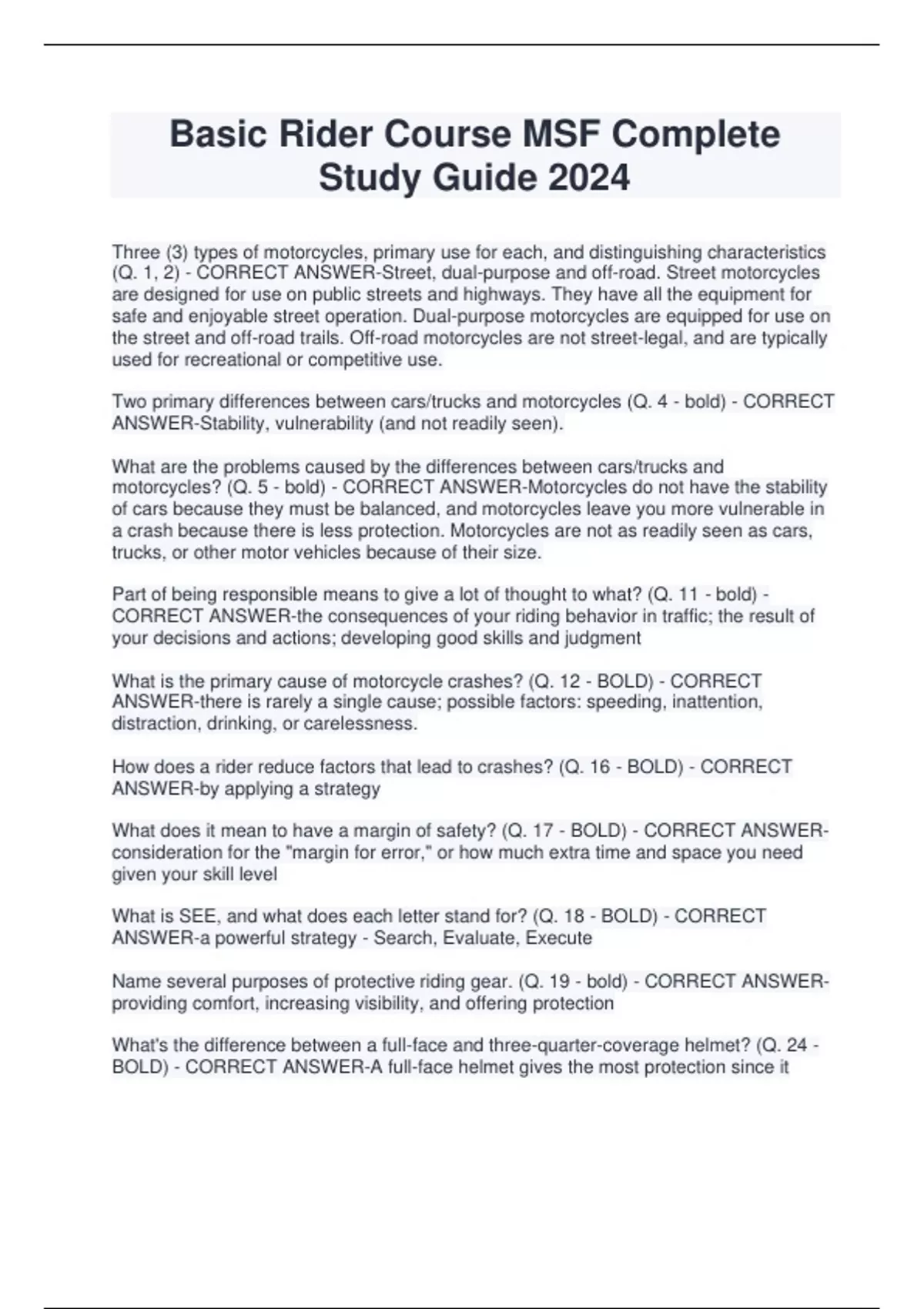 Basic Rider Course MSF Complete Study Guide 2024 Three (3) types of motorcycles, primary use for each, and distinguishing characteristics (Q. 1, 2) - CORRECT ANSWER-Street, dual-purpose and off-road. Street motorcycles are designed for use on public streets and highways. They have all the equipment for safe and enjoyable street operation. Dual-purpose motorcycles are equipped for use on the street and off-road trails. Off-road motorcycles are not street-legal, and are typically used for recreational or competitive use. Two primary differences between cars/trucks and motorcycles (Q. 4 - bold) - CORRECT ANSWER-Stability, vulnerability (and not readily seen). What are the problems caused by the differences between cars/trucks and motorcycles? (Q. 5 - bold) - CORRECT ANSWER-Motorcycles do not have the stability of cars because they must be balanced, and motorcycles leave you more vulnerable in a crash because there is less protection. Motorcycles are not as readily seen as cars, trucks, or other motor vehicles because of their size. Part of being responsible means to give a lot of thought to what? (Q. 11 - bold) - CORRECT ANSWER-the consequences of your riding behavior in traffic; the result of your decisions and actions; developing good skills and judgment What is the primary cause of motorcycle crashes? (Q. 12 - BOLD) - CORRECT ANSWER-there is rarely a single cause; possible factors: speeding, inattention, distraction, drinking, or carelessness. How does a rider reduce factors that lead to crashes? (Q. 16 - BOLD) - CORRECT ANSWER-by applying a strategy What does it mean to have a margin of safety? (Q. 17 - BOLD) - CORRECT ANSWERconsideration for the "margin for error," or how much extra time and space you need given your skill level What is SEE, and what does each letter stand for? (Q. 18 - BOLD) - CORRECT ANSWER-a powerful strategy - Search, Evaluate, Execute Name several purposes of protective riding gear. (Q. 19 - bold) - CORRECT ANSWERproviding comfort, increasing visibility, and offering protection What's the difference between a full-face and three-quarter-coverage helmet? (Q. 24 - BOLD) - CORRECT ANSWER-A full-face helmet gives the most protection since it