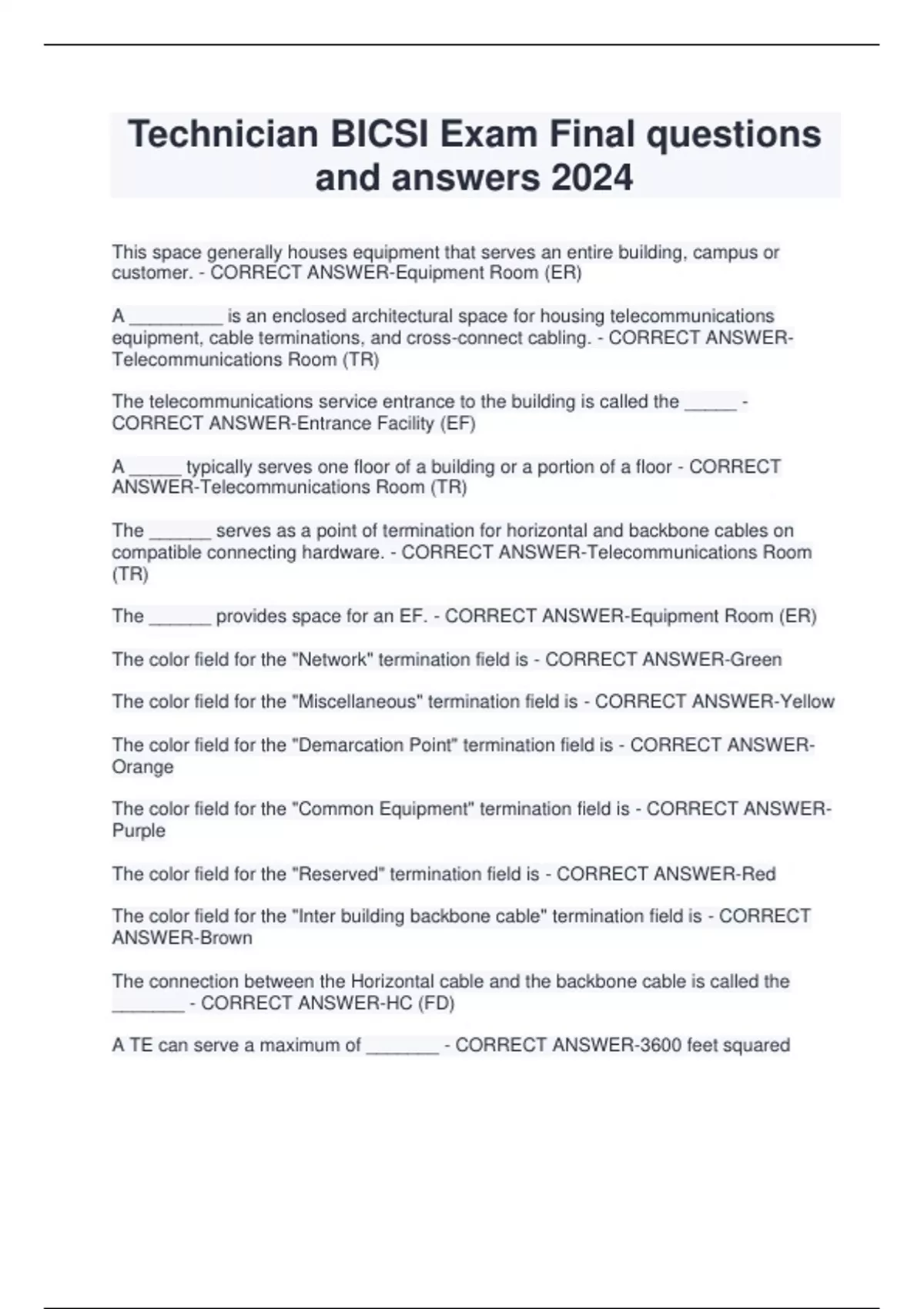 Technician BICSI Exam Final questions and answers 2024 This space generally houses equipment that serves an entire building, campus or customer. - CORRECT ANSWER-Equipment Room (ER) A _________ is an enclosed architectural space for housing telecommunications equipment, cable terminations, and cross-connect cabling. - CORRECT ANSWERTelecommunications Room (TR) The telecommunications service entrance to the building is called the _____ - CORRECT ANSWER-Entrance Facility (EF) A _____ typically serves one floor of a building or a portion of a floor - CORRECT ANSWER-Telecommunications Room (TR) The ______ serves as a point of termination for horizontal and backbone cables on compatible connecting hardware. - CORRECT ANSWER-Telecommunications Room (TR) The ______ provides space for an EF. - CORRECT ANSWER-Equipment Room (ER) The color field for the "Network" termination field is - CORRECT ANSWER-Green The color field for the "Miscellaneous" termination field is - CORRECT ANSWER-Yellow The color field for the "Demarcation Point" termination field is - CORRECT ANSWEROrang