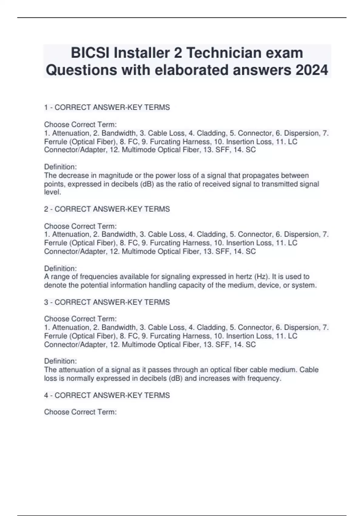 BICSI Installer 2 Technician exam Questions with elaborated answers 2024 1 - CORRECT ANSWER-KEY TERMS Choose Correct Term: 1. Attenuation, 2. Bandwidth, 3. Cable Loss, 4. Cladding, 5. Connector, 6. Dispersion, 7. Ferrule (Optical Fiber), 8. FC, 9. Furcating Harness, 10. Insertion Loss, 11. LC Connector/Adapter, 12. Multimode Optical Fiber, 13. SFF, 14. SC Definition: The decrease in magnitude or the power loss of a signal that propagates between points, expressed in decibels (dB) as the ratio of received signal to transmitted signal level. 2 - CORRECT ANSWER-KEY TERMS Choose Correct Term: 1. Attenuation, 2. Bandwidth, 3. Cable Loss, 4. Cladding, 5. Connector, 6. Dispersion, 7. Ferrule (Optical Fiber), 8. FC, 9. Furcating Harness, 10. Insertion Loss, 11. LC Connector/Adapter, 12. Multimode Optical Fiber, 13. SFF, 14. SC Definition: A range of frequencies available for signaling expressed in hertz (Hz). It is used to denote the potential information handling capacity of the medium, device, or system. 3 - CORRECT ANSWER-KEY TERMS Choose Correct Term: 1. Attenuation, 2. Bandwidth, 3. Cable Loss, 4. Cladding, 5. Connector, 6. Dispersion, 7. Ferrule (Optical Fiber), 8. FC, 9. Furcating Harness, 10. Insertion Loss, 11. LC Connector/Adapter, 12. Multimode Optical Fiber, 13. SFF, 14. SC Definition: The attenuation of a signal as it passes through an optical fiber cable medium. Cable loss is normally expressed in decibels (dB) and increases with frequency. 4 - CORRECT ANSWER-KEY TERMS Choose Correct Term: 1. Attenuation, 2. Bandwidth, 3. Cable Loss, 4. Cladding, 5. Connector, 6. Dispersion, 7. Ferrule (Optical Fiber), 8. FC, 9. Furcating Harness, 10. Insertion Loss, 11. LC Connector/Adapter, 12. Multimode Optical Fiber, 13. SFF, 14. SC Definition: The outer concentric glass layer that surrounds the optical fiber core and has a lower index of refraction than the core. 5 - CORRECT ANSWER-KEY TERMS Choose Correct Term: 1. Attenuation, 2. Bandwidth, 3. Cable Loss, 4. Cladding, 5. Connector, 6. Dispersion, 7. Ferrule (Optical Fiber), 8. FC, 9. Furcating Harness, 10. Insertion Loss, 11. LC Connector/Adapter, 12. Multimode Optical Fiber, 13. SFF, 14. SC Definition: A mechanical device used to provide a means for aligning, attaching, and achieving continuity between conductors or optical fibers. 6 - CORRECT ANSWER-KEY TERMS Choose Correct Term: 1. Attenuation, 2. Bandwidth, 3. Cable Loss, 4. Cladding, 5. Connector, 6. Dispersion, 7. Ferrule (Optical Fiber), 8. FC, 9. Furcating Harness, 10. Insertion Loss, 11. LC Connector/Adapter, 12. Multimode Optical Fiber, 13. SFF, 14. SC Definition: 1. The loss of signal resulting from the scattering of light pulses as they are transmitted through a medium. 2. The widening or spreading out of the modes in light pulses as it progresses along an optical fiber. 3. The characteristics of the sound coverage field of a speaker. 7 - CORRECT ANSWER-KEY TERMS