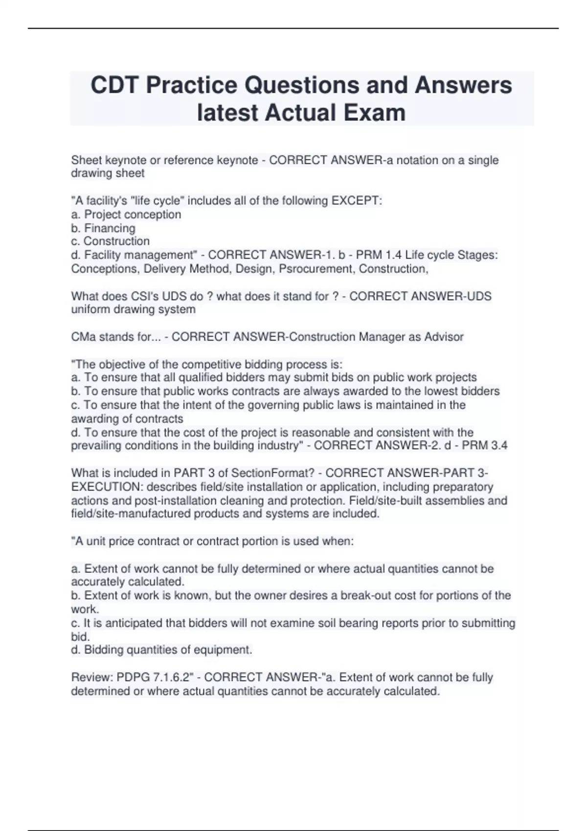 CDT Practice Questions and Answers latest Actual Exam Sheet keynote or reference keynote - CORRECT ANSWER-a notation on a single drawing sheet "A facility's "life cycle" includes all of the following EXCEPT: a. Project conception b. Financing c. Construction d. Facility management" - CORRECT ANSWER-1. b - PRM 1.4 Life cycle Stages: Conceptions, Delivery Method, Design, Psrocurement, Construction, What does CSI's UDS do ? what does it stand for ? - CORRECT ANSWER-UDS uniform drawing system CMa stands for... - CORRECT ANSWER-Construction Manager as Advisor "The objective of the competitive bidding process is: a. To ensure that all qualified bidders may submit bids on public work projects b. To ensure that public works contracts are always awarded to the lowest bidders c. To ensure that the intent of the governing public laws is maintained in the awarding of contracts d. To ensure that the cost of the project is reasonable and consistent with the prevailing conditions in the building industry" - CORRECT ANSWER-2. d - PRM 3.4 What is included in PART 3 of SectionFormat? - CORRECT ANSWER-PART 3- EXECUTION: describes field/site installation or application, including preparatory actions and post-installation cleaning and protection. Field/site-built assemblies and field/site-manufactured products and systems are included. "A unit price contract or contract portion is used when: a. Extent of work cannot be fully determined or where actual quantities cannot be accurately calculated. b. Extent of work is known, but the owner desires a break-out cost for portions of the work. c. It is anticipated that bidders will not examine soil bearing reports prior to submitting bid. d. Bidding quantities of equipment. Review: PDPG 7.1.6.2" - CORRECT ANSWER-"a. Extent of work cannot be fully determined or where actual quantities cannot be accurately calculated. Use of unit prices, allowances and alternates should always be limited to those items required for accurate bidding, in order to keep bidding documents and processes as simple as possible." "The contractual relationship governed by the Conditions of the Contract is between: a. Owner and contractor b. Architect/engineer and contractor c. Owner and Subcontractors d. Owner, contractor, and architect/engineer Review: PDPG 5.5 and 11.3.9" - CORRECT ANSWER-"a. Owner and contractor The owner and the contractor are the parties to the construction contract, hence they are subject to the Conditions of the Contract. Yes, the duties of the architect are described in the Conditions of the Contract, but they are governed by the separate Owner/Architect or Owner/Engineer Agreement." How long does a contractor required to execute corrections in the Work after Substantial Completion? - CORRECT ANSWER-one year "Which of the following would be included in Available Information? a. Bid security requirements b. Environmental Impact Statement c. Time of completion to construct the project d. Description of the Work Review: PDPG 11.4.5" - CORRECT ANSWER-"b. Environmental Impact Statement Available Information is the place to provide reference information such as this that doesn't belong in the contract. Bid security info? In the Instructions for Procurement. Time of Completion? It's contractual - where would you put it? Description of Work? Name the Division 01 section where that belongs." "Instructions for Procurement: a. Are used only on private projects b. Frequently are standard industry forms c. May include the geotechnical report as an attachment d. Are binding upon the Contractor Review: PDPG 11.4.4 " - CORRECT ANSWER-"b. Frequently are standard industry form