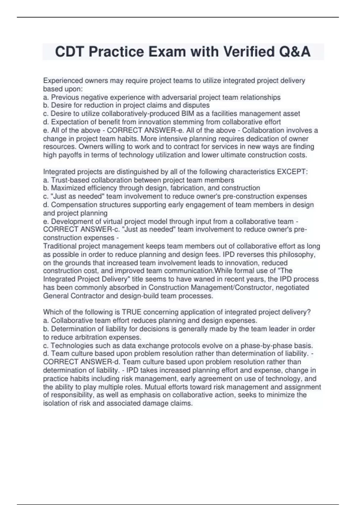 CDT Practice Exam with Verified Q&A Experienced owners may require project teams to utilize integrated project delivery based upon: a. Previous negative experience with adversarial project team relationships b. Desire for reduction in project claims and disputes c. Desire to utilize collaboratively-produced BIM as a facilities management asset d. Expectation of benefit from innovation stemming from collaborative effort e. All of the above - CORRECT ANSWER-e. All of the above - Collaboration involves a change in project team habits. More intensive planning requires dedication of owner resources. Owners willing to work and to contract for services in new ways are finding high payoffs in terms of technology utilization and lower ultimate construction costs. Integrated projects are distinguished by all of the following characteristics EXCEPT: a. Trust-based collaboration between project team members b. Maximized efficiency through design, fabrication, and construction c. "Just as needed" team involvement to reduce owner's pre-construction expenses d. Compensation structures supporting early engagement of team members in design and project planning e. Development of virtual project model through input from a collaborative team - CORRECT ANSWER-c. "Just as needed" team involvement to reduce owner's preconstruction expenses - Traditional project management keeps team members out of collaborative effort as long as possible in order to reduce planning and design fees. IPD reverses this philosophy, on the grounds that increased team involvement leads to innovation, reduced construction cost, and improved team communication.While formal use of "The Integrated Project Delivery" title seems to have waned in recent years, the IPD process has been commonly absorbed in Construction Management/Constructor, negotiated General Contractor and design-build team processes. Which of the following is TRUE concerning application of integrated project delivery? a. Collaborative team effort reduces planning and design expenses. b. Determination of liability for decisions is generally made by the team leader in order to reduce arbitration expenses. c. Technologies such as data exchange protocols evolve on a phase-by-phase basis. d. Team culture based upon problem resolution rather than determination of liability. - CORRECT ANSWER-d. Team culture based upon problem resolution rather than determination of liability. - IPD takes increased planning effort and expense, change in practice habits including risk management, early agreement on use of technology, and the ability to play multiple roles. Mutual efforts toward risk management and assignment of responsibility, as well as emphasis on collaborative action, seeks to minimize the isolation of risk and associated damage claims