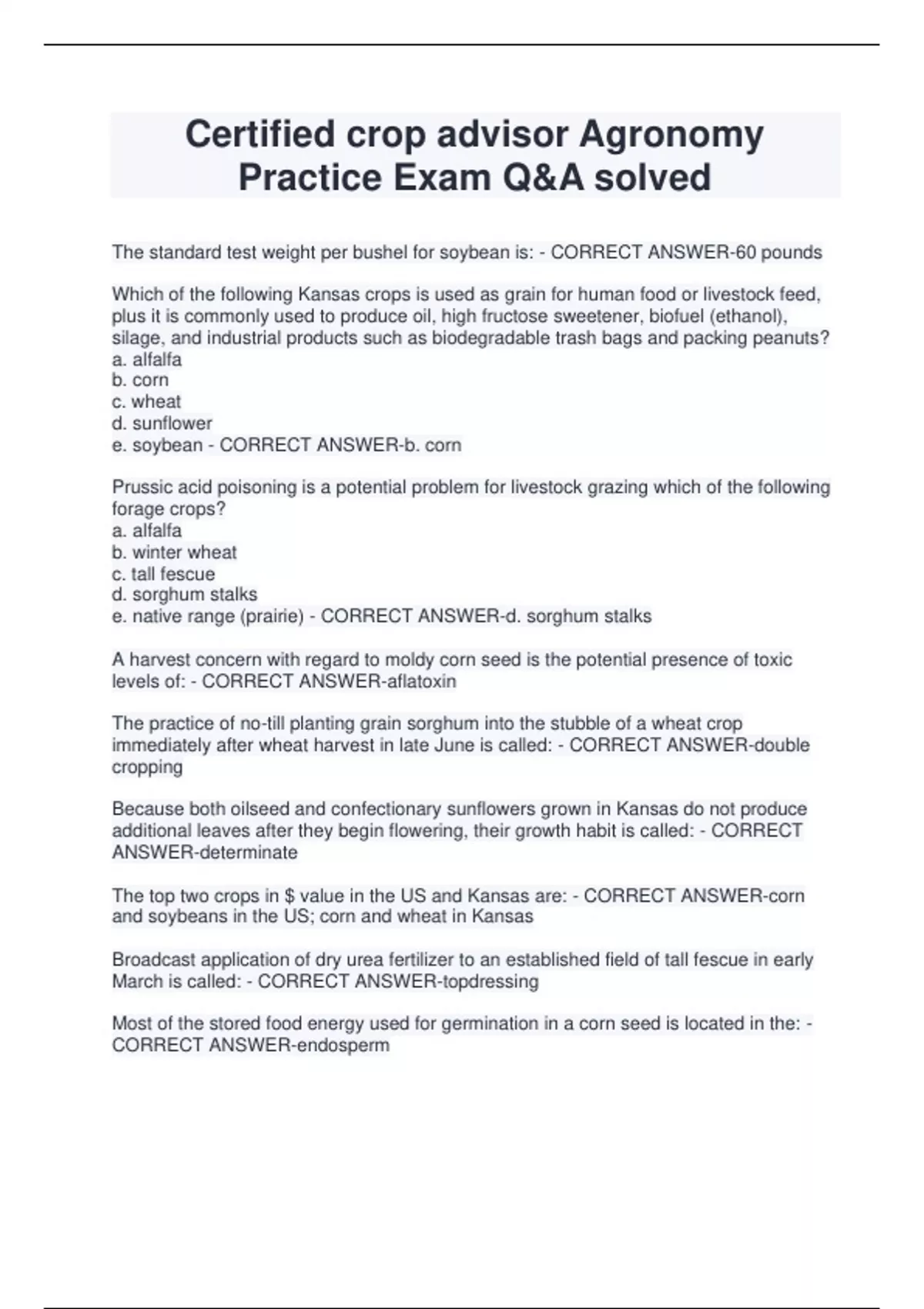 Certified crop advisor Agronomy Practice Exam Q&A solved The standard test weight per bushel for soybean is: - CORRECT ANSWER-60 pounds Which of the following Kansas crops is used as grain for human food or livestock feed, plus it is commonly used to produce oil, high fructose sweetener, biofuel (ethanol), silage, and industrial products such as biodegradable trash bags and packing peanuts? a. alfalfa b. corn c. wheat d. sunflower e. soybean - CORRECT ANSWER-b. corn Prussic acid poisoning is a potential problem for livestock grazing which of the following forage crops? a. alfalfa b. winter wheat c. tall fescue d. sorghum stalks e. native range (prairie) - CORRECT ANSWER-d. sorghum stalks A harvest concern with regard to moldy corn seed is the potential presence of toxic levels of: - CORRECT ANSWER-aflatoxin The practice of no-till planting grain sorghum into the stubble of a wheat crop immediately after wheat harvest in late June is called: - CORRECT ANSWER-double cropping Because both oilseed and confectionary sunflowers grown in Kansas do not produce additional leaves after they begin flowering, their growth habit is called: - CORRECT ANSWER-determinate The top two crops in $ value in the US and Kansas are: - CORRECT ANSWER-corn and soybeans in the US; corn and wheat in Kansas Broadcast application of dry urea fertilizer to an established field of tall fescue in early March is called: - CORRECT ANSWER-topdressing Most of the stored food energy used for germination in a corn seed is located in the: - CORRECT ANSWER-endosperm European corn borers cause damage to corn by: - CORRECT ANSWER-feeding in the stalks during the larval stage