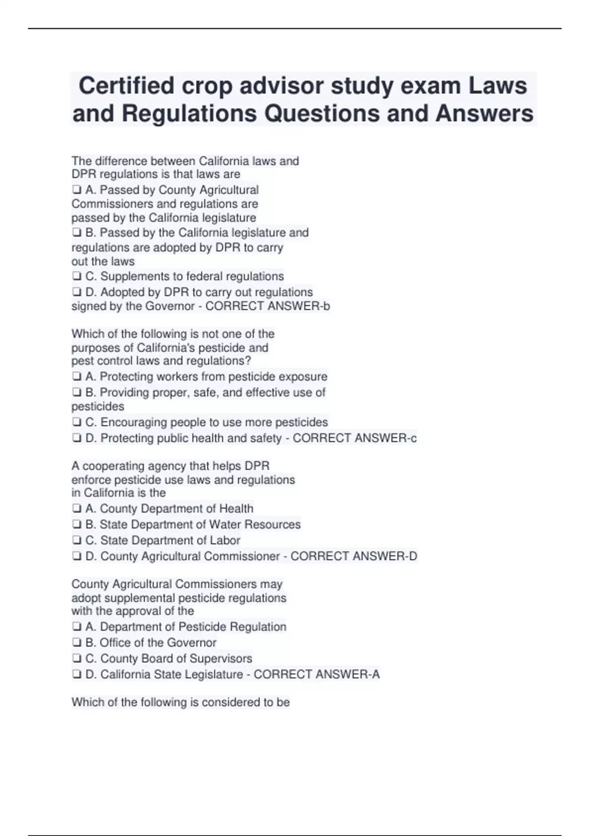 Certified crop advisor study exam Laws and Regulations Questions and Answers The difference between California laws and DPR regulations is that laws are A. Passed by County Agricultural Commissioners and regulations are passed by the California legislature B. Passed by the California legislature and regulations are adopted by DPR to carry out the laws C. Supplements to federal regulations D. Adopted by DPR to carry out regulations signed by the Governor - CORRECT ANSWER-b Which of the following is not one of the purposes of California's pesticide and pest control laws and regulations? A. Protecting workers from pesticide exposure B. Providing proper, safe, and effective use of pesticides C. Encouraging people to use more pesticides D. Protecting public health and safety - CORRECT ANSWER-c A cooperating agency that helps DPR enforce pesticide use laws and regulations in California is the A. County Department of Health B. State Department of Water Resources C. State Department of Labor D. County Agricultural Commissioner - CORRECT ANSWER-D County Agricultural Commissioners may adopt supplemental pesticide regulations with the approval of the A. Department of Pesticide Regulation B. Office of the Governor C. County Board of Supervisors D. California State Legislature - CORRECT ANSWER-A Which of the following is considered to be pesticide labeling? A. Spray nozzle catalog B. A printed pesticide advertisement C. The federal Worker Protection Standard D. A written recommendation - CORRECT ANSWER-c When a pesticide registrant allows a pesticide product registration to lapse, pest control dealers A. Must immediately return all unsold stock B. Can sell and deliver the pesticide product for two years C. Must retrieve all previously sold stock D. Can indefinitely sell and deliver the pesticid