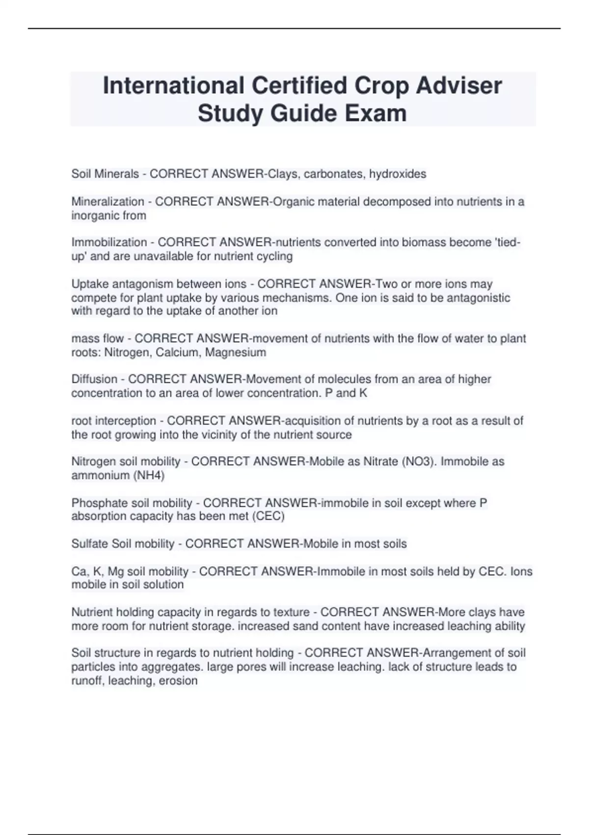 International Certified Crop Adviser Study Guide Exam Soil Minerals - CORRECT ANSWER-Clays, carbonates, hydroxides Mineralization - CORRECT ANSWER-Organic material decomposed into nutrients in a inorganic from Immobilization - CORRECT ANSWER-nutrients converted into biomass become 'tiedup' and are unavailable for nutrient cycling Uptake antagonism between ions - CORRECT ANSWER-Two or more ions may compete for plant uptake by various mechanisms. One ion is said to be antagonistic with regard to the uptake of another ion mass flow - CORRECT ANSWER-movement of nutrients with the flow of water to plant roots: Nitrogen, Calcium, Magnesium Diffusion - CORRECT ANSWER-Movement of molecules from an area of higher concentration to an area of lower concentration. P and K root interception - CORRECT ANSWER-acquisition of nutrients by a root as a result of the root growing into the vicinity of the nutrient source Nitrogen soil mobility - CORRECT ANSWER-Mobile as Nitrate (NO3). Immobile as ammonium (NH4) Phosphate soil mobility - CORRECT ANSWER-immobile in soil except where P absorption capacity has been met (CEC) Sulfate Soil mobility - CORRECT ANSWER-Mobile in most soils Ca, K, Mg soil mobility - CORRECT ANSWER-Immobile in most soils held by CEC. Ions mobile in soil solution Nutrient holding capacity in regards to texture - CORRECT ANSWER-More clays have more room for nutrient storage. increased sand content have increased leaching ability Soil structure in regards to nutrient holding - CORRECT ANSWER-Arrangement of soil particles into aggregates. large pores will increase leaching. lack of structure leads to runoff, leaching, erosion