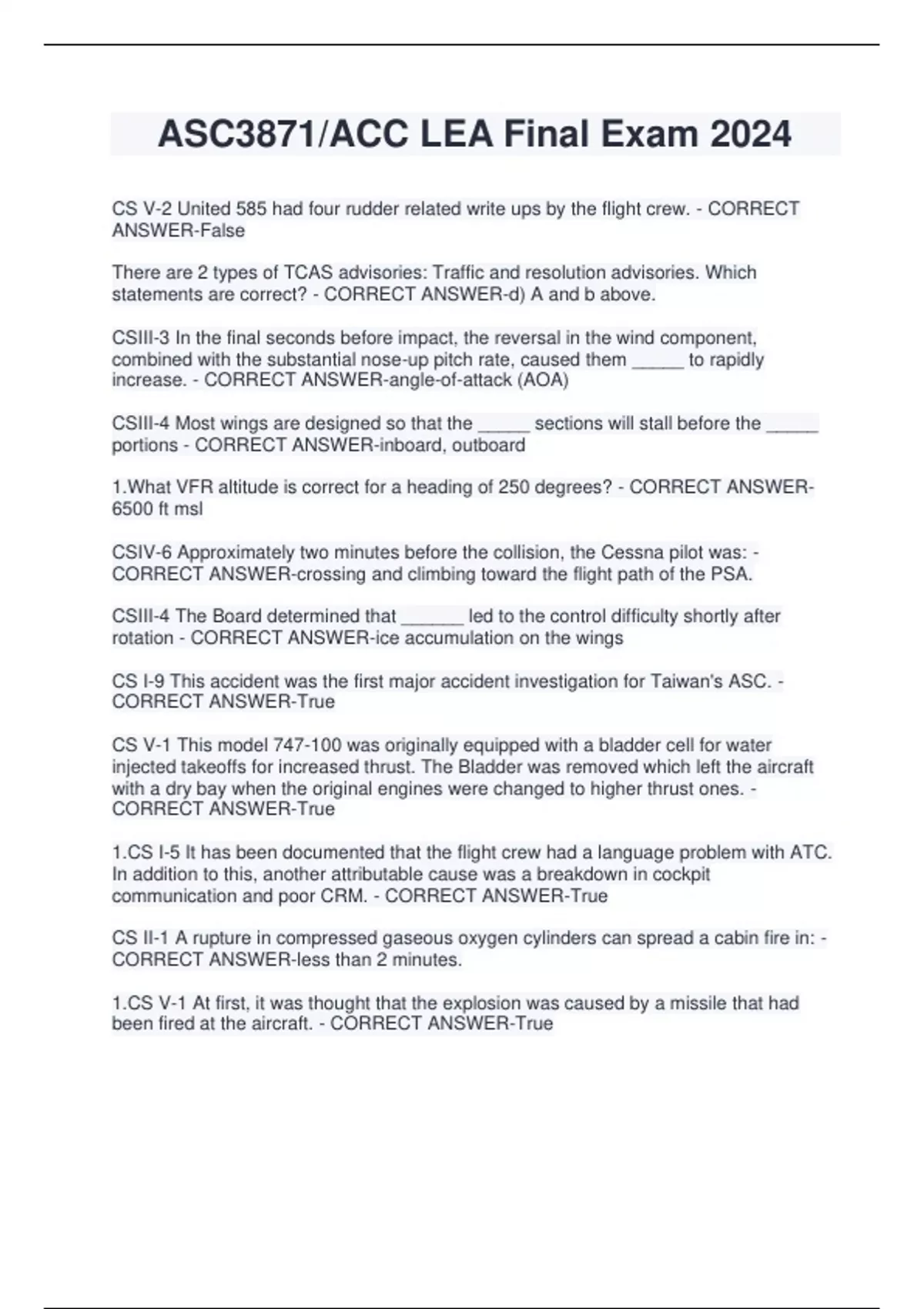 ASC3871/ACC LEA Final Exam 2024 CS V-2 United 585 had four rudder related write ups by the flight crew. - CORRECT ANSWER-False There are 2 types of TCAS advisories: Traffic and resolution advisories. Which statements are correct? - CORRECT ANSWER-d) A and b above. CSIII-3 In the final seconds before impact, the reversal in the wind component, combined with the substantial nose-up pitch rate, caused them _____ to rapidly increase. - CORRECT ANSWER-angle-of-attack (AOA) CSIII-4 Most wings are designed so that the _____ sections will stall before the _____ portions - CORRECT ANSWER-inboard, outboard 1.What VFR altitude is correct for a heading of 250 degrees? - CORRECT ANSWER6500 ft msl CSIV-6 Approximately two minutes before the collision, the Cessna pilot was: - CORRECT ANSWER-crossing and climbing toward the flight path of the PSA. CSIII-4 The Board determined that ______ led to the control difficulty shortly after rotation - CORRECT ANSWER-ice accumulation on the wings CS I-9 This accident was the first major accident investigation for Taiwan's ASC. - CORRECT ANSWER-True CS V-1 This model 747-100 was originally equipped with a bladder cell for water injected takeoffs for increased thrust. The Bladder was removed which left the aircraft with a dry bay when the original engines were changed to higher thrust ones. - CORRECT ANSWER-True 1.CS I-5 It has been documented that the flight crew had a language problem with ATC. In addition to this, another attributable cause was a breakdown in cockpit communication and poor CRM. - CORRECT ANSWER-True