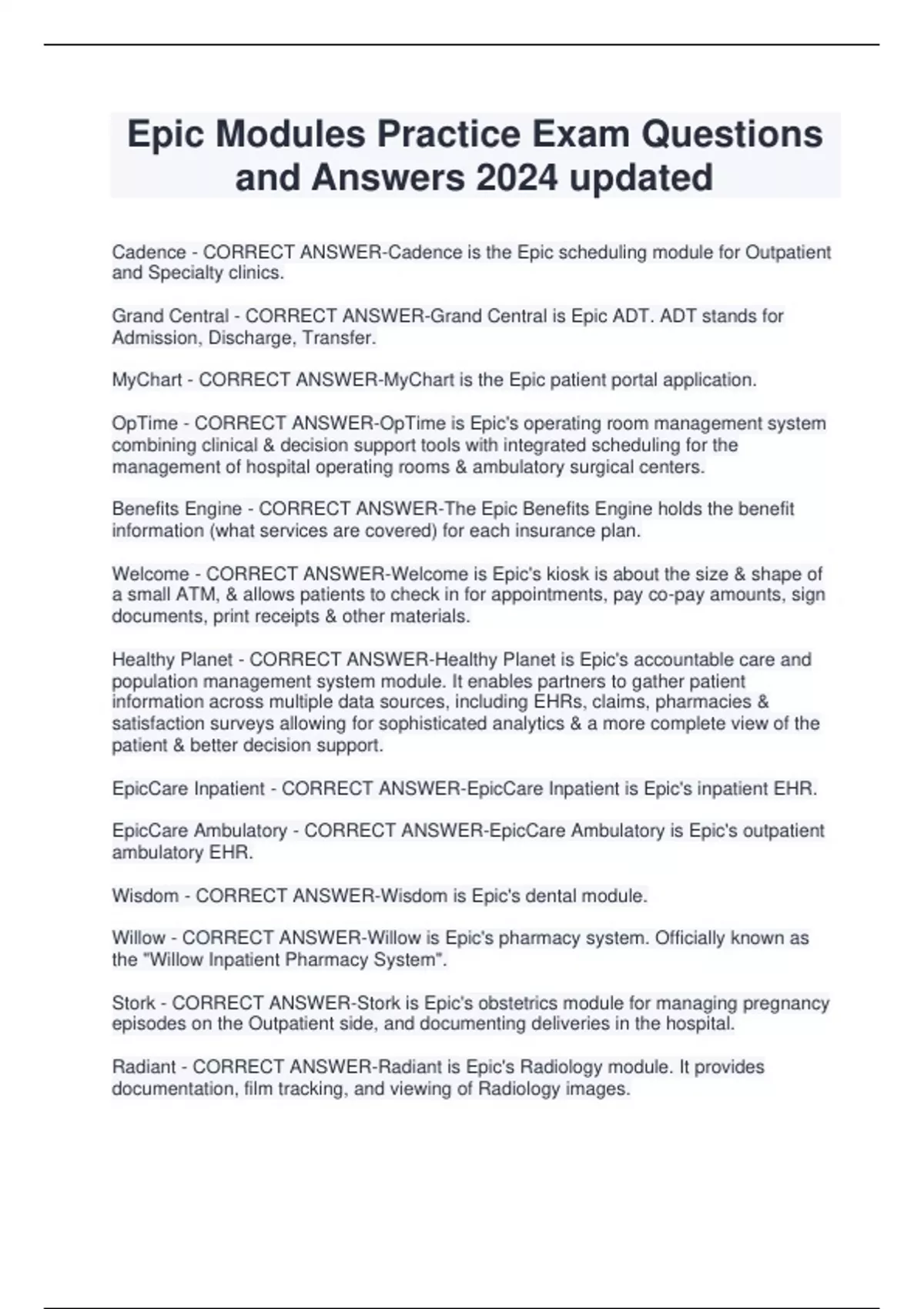 Epic Modules Practice Exam Questions and Answers 2024 updated Cadence - CORRECT ANSWER-Cadence is the Epic scheduling module for Outpatient and Specialty clinics. Grand Central - CORRECT ANSWER-Grand Central is Epic ADT. ADT stands for Admission, Discharge, Transfer. MyChart - CORRECT ANSWER-MyChart is the Epic patient portal application. OpTime - CORRECT ANSWER-OpTime is Epic's operating room management system combining clinical & decision support tools with integrated scheduling for the management of hospital operating rooms & ambulatory surgical centers. Benefits Engine - CORRECT ANSWER-The Epic Benefits Engine holds the benefit information (what services are covered) for each insurance plan. Welcome - CORRECT ANSWER-Welcome is Epic's kiosk is about the size & shape of a small ATM, & allows patients to check in for appointments, pay co-pay amounts, sign documents, print receipts & other materials. Healthy Planet - CORRECT ANSWER-Healthy Planet is Epic's accountable care and population management system module. It enables partners to gather patient information across multiple data sources, including EHRs, claims, pharmacies & satisfaction surveys allowing for sophisticated analytics & a more complete view of the patient & better decision support. EpicCare Inpatient - CORRECT ANSWER-EpicCare Inpatient is Epic's inpatient EHR. EpicCare Ambulatory - CORRECT ANSWER-EpicCare Ambulatory is Epic's outpatient ambulatory EHR. Wisdom - CORRECT ANSWER-Wisdom is Epic's dental module. Willow - CORRECT ANSWER-Willow is Epic's pharmacy system. Officially known as the "Willow Inpatient Pharmacy System". Stork - CORRECT ANSWER-Stork is Epic's obstetrics module for managing pregnancy episodes on the Outpatient side, and documenting deliveries in the hospital. Radiant - CORRECT ANSWER-Radiant is Epic's Radiology module. It provides documentation, film tracking, and viewing of Radiology images