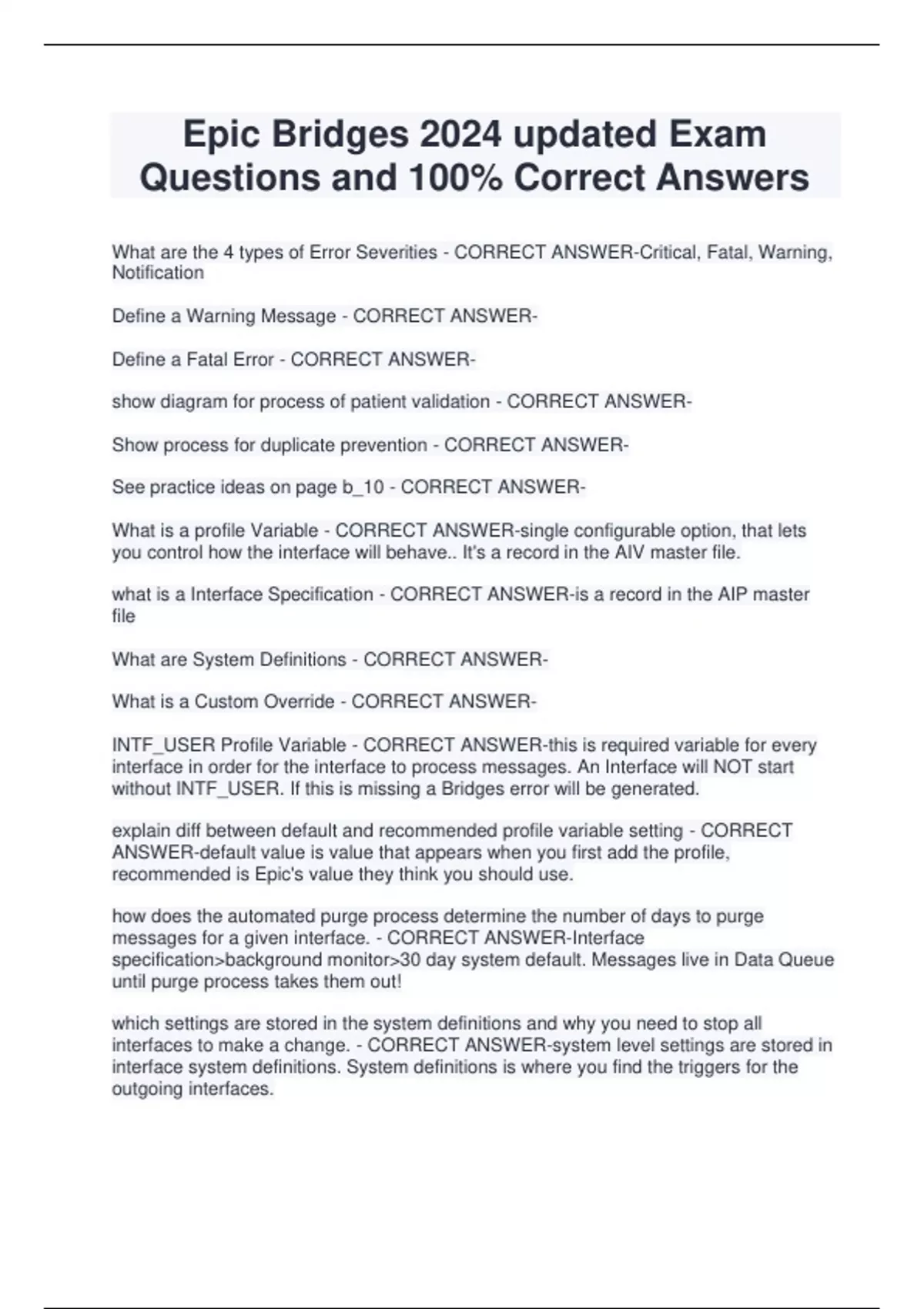 Epic Bridges 2024 updated Exam Questions and 100% Correct Answers What are the 4 types of Error Severities - CORRECT ANSWER-Critical, Fatal, Warning, Notification Define a Warning Message - CORRECT ANSWERDefine a Fatal Error - CORRECT ANSWERshow diagram for process of patient validation - CORRECT ANSWERShow process for duplicate prevention - CORRECT ANSWERSee practice ideas on page b_10 - CORRECT ANSWERWhat is a profile Variable - CORRECT ANSWER-single configurable option, that lets you control how the interface will behave.. It's a record in the AIV master file.