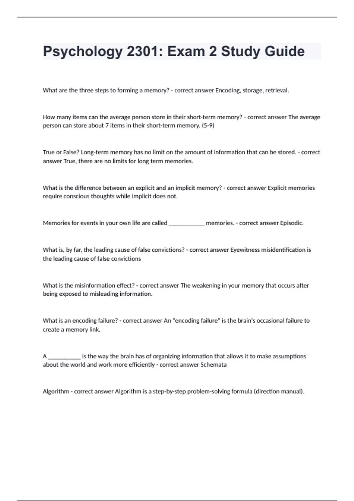 Psychology 2301: Exam 2 Study GuideWhat are the three steps to forming a memory? - correct answer Encoding, storage, retrieval. How many items can the average person store in their short-term memory? - correct answer The average person can store about 7 items in their short-term memory. (5-9) True or False? Long-term memory has no limit on the amount of information that can be stored. - correct answer True, there are no limits for long term memories. What is the difference between an explicit and an implicit memory? - correct answer Explicit memories require conscious thoughts while implicit does not. Memories for events in your own life are called ___________ memories. - correct answer Episodic. What is, by far, the leading cause of false convictions? - correct answer Eyewitness misidentification is the leading cause of false convictions What is the misinformation effect? - correct answer The weakening in your memory that occurs after being exposed to misleading information. What is an encoding failure? - correct answer An "encoding failure" is the brain's occasional failure to create a memory link. A __________ is the way the brain has of organizing information that allows it to make assumptions about the world and work more efficiently - correct answer Schemata Algorithm - correct answer Algorithm is a step-by-step problem-solving formula (direction manual).