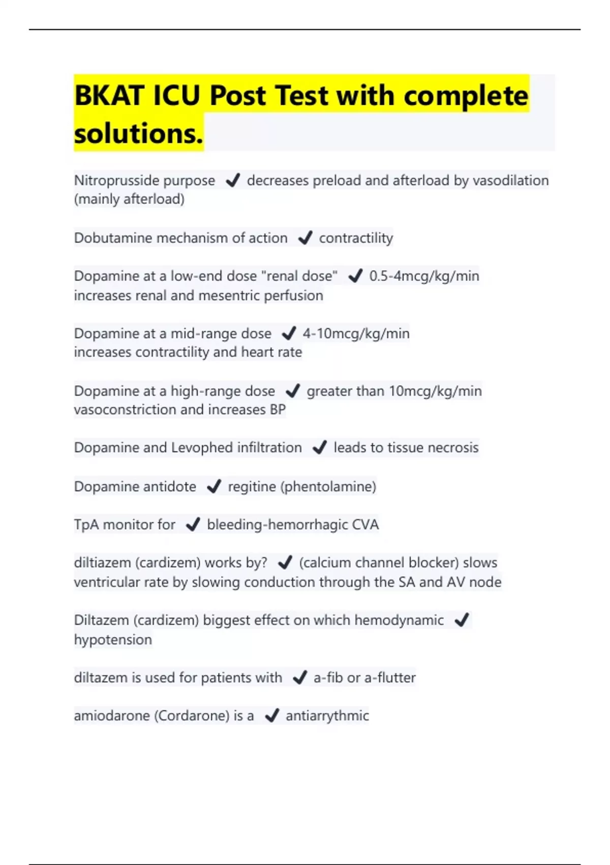 BKAT ICU Post Test with complete solutions. Nitroprusside purpose ️ decreases preload and afterload by vasodilation (mainly afterload) Dobutamine mechanism of action ️ contractility Dopamine at a low-end dose "renal dose" ️ 0.5-4mcg/kg/min increases renal and mesentric perfusion Dopamine at a mid-range dose ️ 4-10mcg/kg/min increases contractility and heart rate Dopamine at a high-range dose ️ greater than 10mcg/kg/min vasoconstriction and increases BP Dopamine and Levophed infiltration ️ leads to tissue necrosis Dopamine antidote ️ regitine (phentolamine) TpA monitor for ️ bleeding-hemorrhagic CVA diltiazem (cardizem) works by? ️ (calcium channel blocker) slows ventricular rate by slowing conduction through the SA and AV node Diltazem (cardizem) biggest effect on which hemodynamic ️ hypotension diltazem is used for patients with ️ a-fib or a-flutter amiodarone (Cordarone) is a ️ antiarrythmic