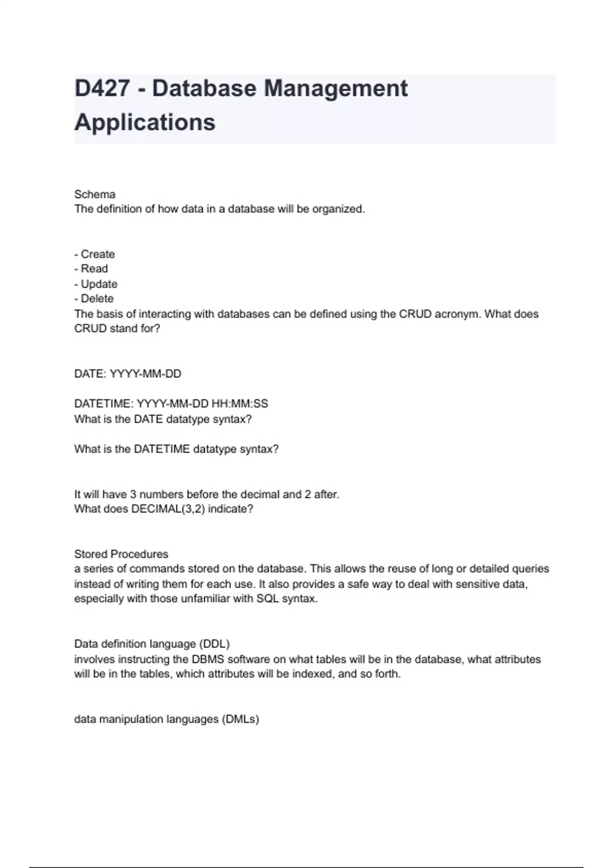 D427 - Database Management Applications Exam Questions Schema The definition of how data in a database will be organized. - Create - Read - Update - Delete The basis of interacting with databases can be defined using the CRUD acronym. What does CRUD stand for? DATE: YYYY-MM-DD DATETIME: YYYY-MM-DD HH:MM:SS What is the DATE datatype syntax? What is the DATETIME datatype syntax? It will have 3 numbers before the decimal and 2 after. What does DECIMAL(3,2) indicate? Stored Procedures a series of commands stored on the database. This allows the reuse of long or detailed queries instead of writing them for each use. It also provides a safe way to deal with sensitive data, especially with those unfamiliar with SQL syntax. Data definition language (DDL) involves instructing the DBMS software on what tables will be in the database, what attributes will be in the tables, which attributes will be indexed, and so forth. data manipulation languages (DMLs) refers to the four basic operations that can and must be performed on data stored in any DBMS (or in any other data storage arrangement, for that matter): data retrieval, data update, insertion of new records, and deletion of existing records. SELECT * FROM CUSTOMER WHERE CUSTNUMB BETWEEN 1 AND 2; What would the SELECT statement look like if you use a BETWEEN. SELECT * FROM CUSTOMER WHERE HQCITY IN ('Atlanta', 'Chicago', 'Washington'); What would the SELECT statement look like if you use a IN. SELECT * FROM CUSTOMER WHERE HQCITY LIKE 'W%'; What would the SELECT statement look like if you use a LIKE. A% - The "%" means that any string of characters can follow afterwards. The percent sign represents zero or more arbitrary regular characters A_ - The _ means that there will be exactly one letter following the A. The underscore represents a single arbitrary regular character. What are the two ways of using the LIKE command? The clause can include the term ASC at the end to make ascending explicit or it can include DESC for descending order. The default order for ORDER BY is ascending. How can you make it descending order? SELECT AVG/SUM/MIN/MAX/COUNT(Column_Name) FROM SALES WHERE Name = 'Matt'; Command to use AVG/SUM/MIN/MAX/COUNT aggregate functions? o One is that the tables to be joined must be listed in the FROM clause. o Two is that the join attributes in the tables being joined must be declared and matched to each other in the WHERE clause. There are two specifications to make in the SELECT statement to make a join work. SELECT SPNAME FROM SALESPERSON, CUSTOMER WHERE SALESPERSON.SPNUM=CUSTOMER.SPNUM Example of JOIN CAUSE.