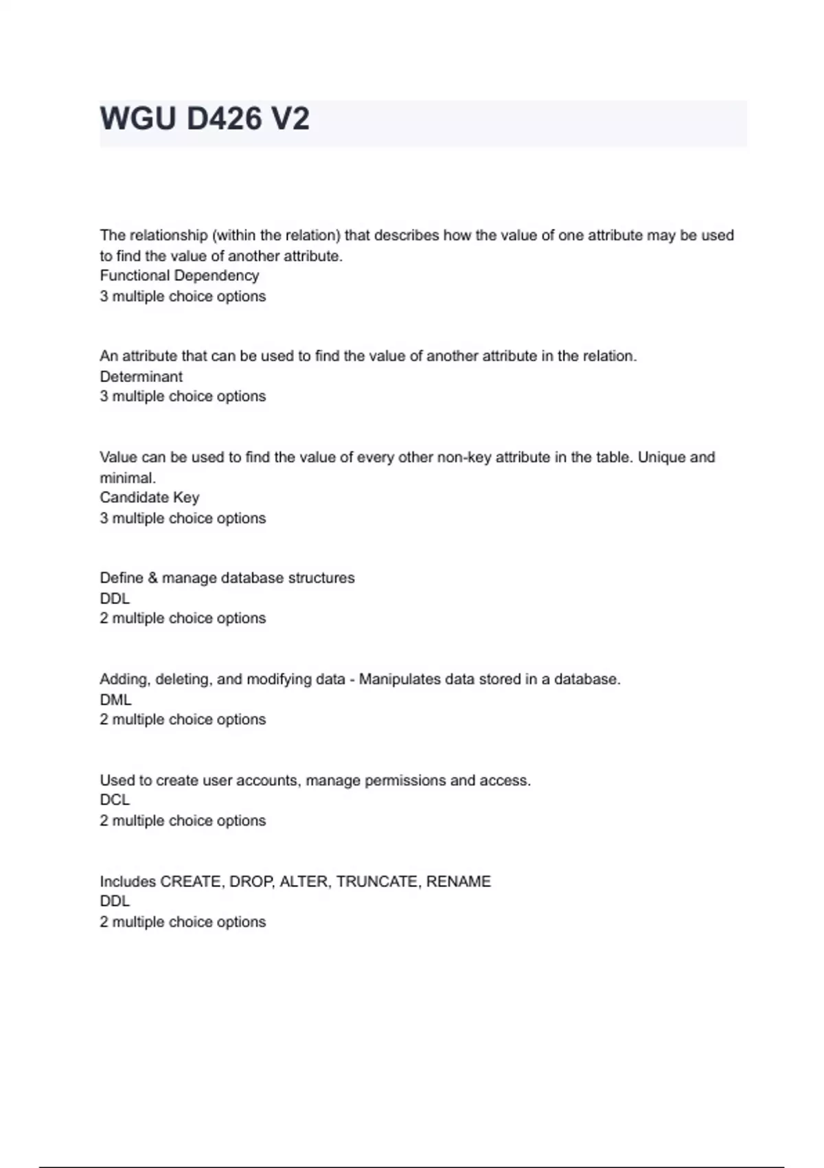 WGU D426 V2 Exam Questions And Answers The relationship (within the relation) that describes how the value of one attribute may be used to find the value of another attribute. Functional Dependency 3 multiple choice options An attribute that can be used to find the value of another attribute in the relation. Determinant 3 multiple choice options Value can be used to find the value of every other non-key attribute in the table. Unique and minimal. Candidate Key 3 multiple choice options Define & manage database structures DDL 2 multiple choice options Adding, deleting, and modifying data - Manipulates data stored in a database. DML 2 multiple choice options Used to create user accounts, manage permissions and access. DCL 2 multiple choice options Includes CREATE, DROP, ALTER, TRUNCATE, RENAME DDL 2 multiple choice options A view created and stored on the database. Underlying data is changed and also updated in this view. Uses memory space. Materialized View 2 multiple choice options Not stored in memory. Only computed when used or accessed. Virtual View 2 multiple choice options The data about the data. Describes elements such as columns, names, and data type. Metadata 3 multiple choice options Ordered collection of elements in parentheses. Tuple 3 multiple choice options % of table rows selected by a query Hit Ration 3 multiple choice options Reads blocks directly, without accessing an index. Table Scan 3 multiple choice options Reads index blocks sequentially in order to locate the needed table blocks. Index Scan 2 multiple choice options Database repeatedly splits the index in two until it finds a match. Binary Search 3 multiple choice options