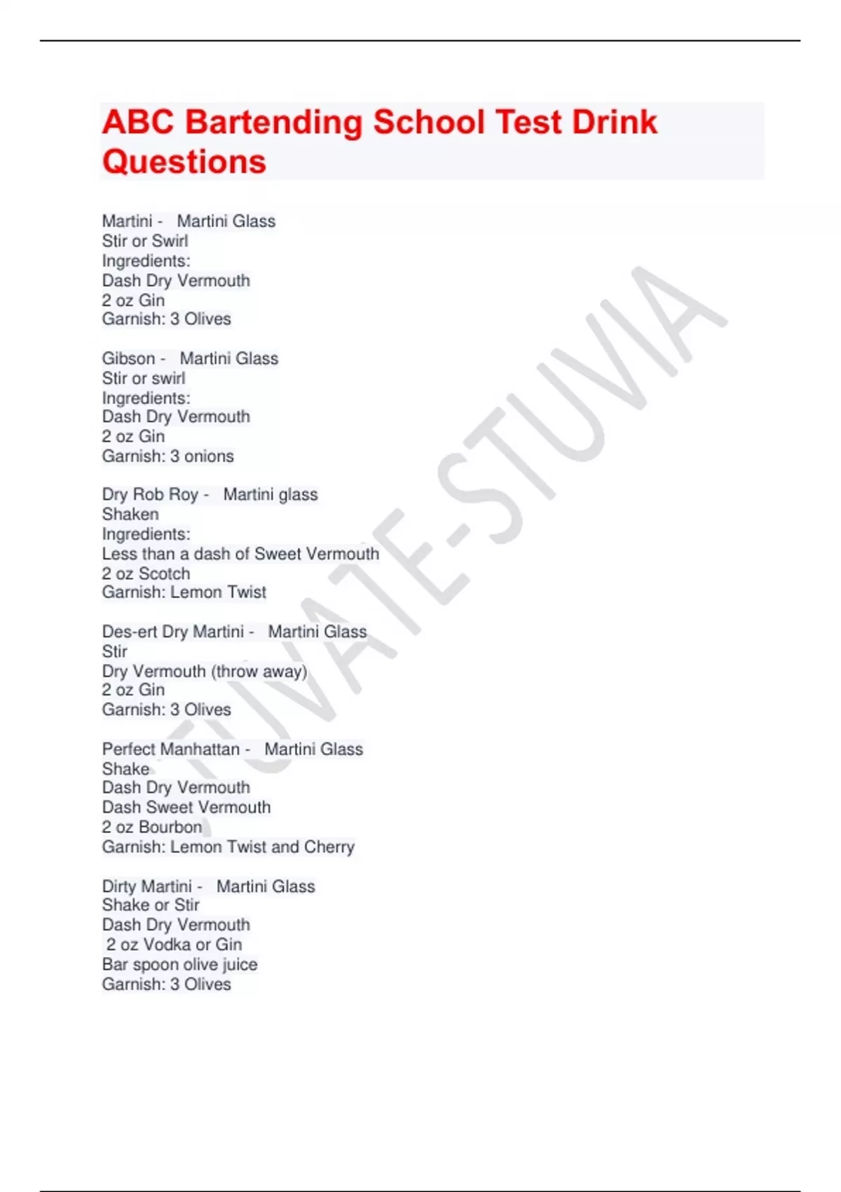 ABC Bartending School Test Drink Questions