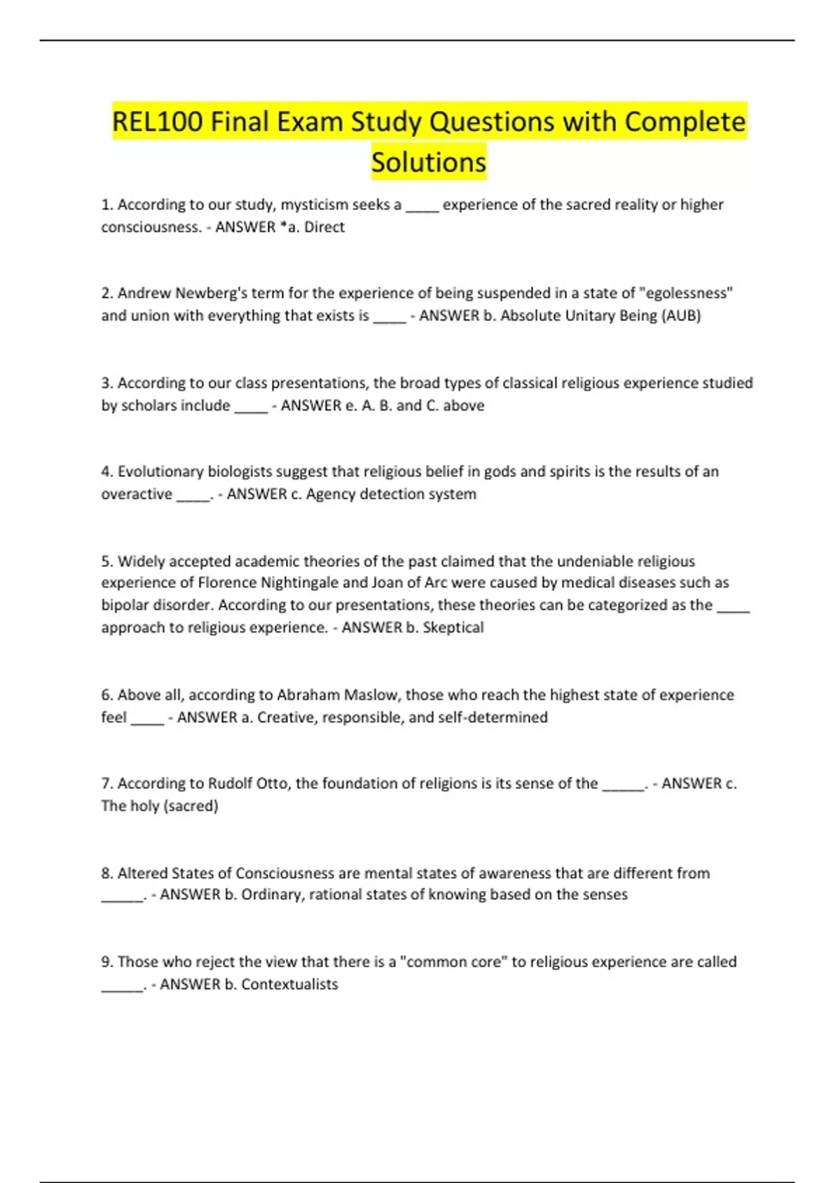 . According to our study, mysticism seeks a ____ experience of the sacred reality or higher consciousness. - ANSWER *a. Direct 2. Andrew Newberg's term for the experience of being suspended in a state of "egolessness" and union with everything that exists is ____ - ANSWER b. Absolute Unitary Being (AUB) 3. According to our class presentations, the broad types of classical religious experience studied by scholars include ____ - ANSWER e. A. B. and C. above