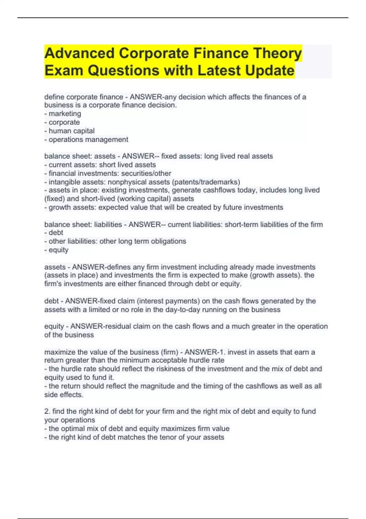 define corporate finance - ANSWER-any decision which affects the finances of a business is a corporate finance decision. - marketing - corporate - human capital - operations management balance sheet: assets - ANSWER-- fixed assets: long lived real assets - current assets: short lived assets - financial investments: securities/other - intangible assets: nonphysical assets (patents/trademarks) - assets in place: existing investments, generate cashflows today, includes long lived (fixed) and short-lived (working capital) assets - growth assets: expected value that will be created by future investments balance sheet: liabilities - ANSWER-- current liabilities: short-term liabilities of the firm - debt - other liabilities: other long term obligations - equity assets - ANSWER-defines any firm investment including already made investments (assets in place) and investments the firm is expected to make (growth assets). the firm's investments are either financed through debt or equity. debt - ANSWER-fixed claim (interest payments) on the cash flows generated by the assets with a limited or no role in the day-to-day running on the business equity - ANSWER-residual claim on the cash flows and a much greater in the operation of the business maximize the value of the business (firm) - ANSWER-1. invest in assets that earn a return greater than the minimum acceptable hurdle rate - the hurdle rate should reflect the riskiness of the investment and the mix of debt and equity used to fund it. - the return should reflect the magnitude and the timing of the cashflows as well as all side effects. 2. find the right kind of debt for your firm and the right mix of debt and equity to fund your operations - the optimal mix of debt and equity maximizes firm value - the right kind of debt matches the tenor of your assets