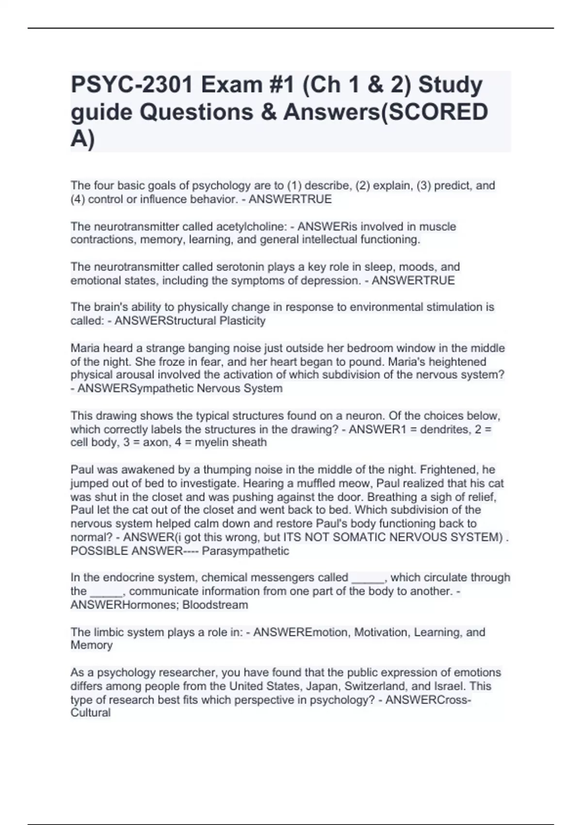 The four basic goals of psychology are to (1) describe, (2) explain, (3) predict, and (4) control or influence behavior. - ANSWERTRUE The neurotransmitter called acetylcholine: - ANSWERis involved in muscle contractions, memory, learning, and general intellectual functioning. The neurotransmitter called serotonin plays a key role in sleep, moods, and emotional states, including the symptoms of depression. - ANSWERTRUE The brain's ability to physically change in response to environmental stimulation is called: - ANSWERStructural Plasticity Maria heard a strange banging noise just outside her bedroom window in the middle of the night. She froze in fear, and her heart began to pound. Maria's heightened physical arousal involved the activation of which subdivision of the nervous system? - ANSWERSympathetic Nervous System This drawing shows the typical structures found on a neuron. Of the choices below, which correctly labels the structures in the drawing? - ANSWER1 = dendrites, 2 = cell body, 3 = axon, 4 = myelin sheath Paul was awakened by a thumping noise in the middle of the night. Frightened, he jumped out of bed to investigate. Hearing a muffled meow, Paul realized that his cat was shut in the closet and was pushing against the door. Breathing a sigh of relief, Paul let the cat out of the closet and went back to bed. Which subdivision of the nervous system helped calm down and restore Paul's body functioning back to normal? - ANSWER(i got this wrong, but ITS NOT SOMATIC NERVOUS SYSTEM) . POSSIBLE ANSWER---- Parasympathetic