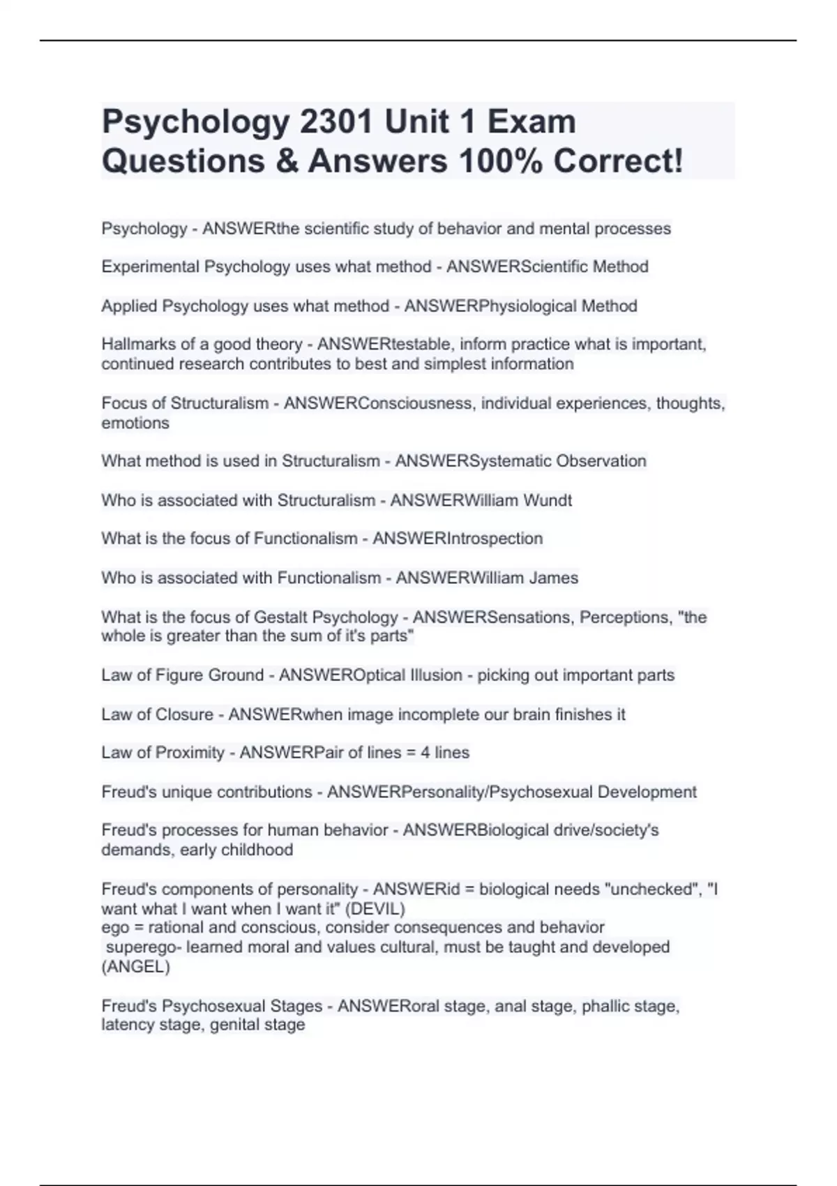 Psychology - ANSWERthe scientific study of behavior and mental processes Experimental Psychology uses what method - ANSWERScientific Method Applied Psychology uses what method - ANSWERPhysiological Method Hallmarks of a good theory - ANSWERtestable, inform practice what is important, continued research contributes to best and simplest information Focus of Structuralism - ANSWERConsciousness, individual experiences, thoughts, emotions What method is used in Structuralism - ANSWERSystematic Observation Who is associated with Structuralism - ANSWERWilliam Wundt What is the focus of Functionalism - ANSWERIntrospection Who is associated with Functionalism - ANSWERWilliam James What is the focus of Gestalt Psychology - ANSWERSensations, Perceptions, "the whole is greater than the sum of it's parts" Law of Figure Ground - ANSWEROptical Illusion - picking out important parts Law of Closure - ANSWERwhen image incomplete our brain finishes it Law of Proximity - ANSWERPair of lines = 4 lines Freud's unique contributions - ANSWERPersonality/Psychosexual Development Freud
