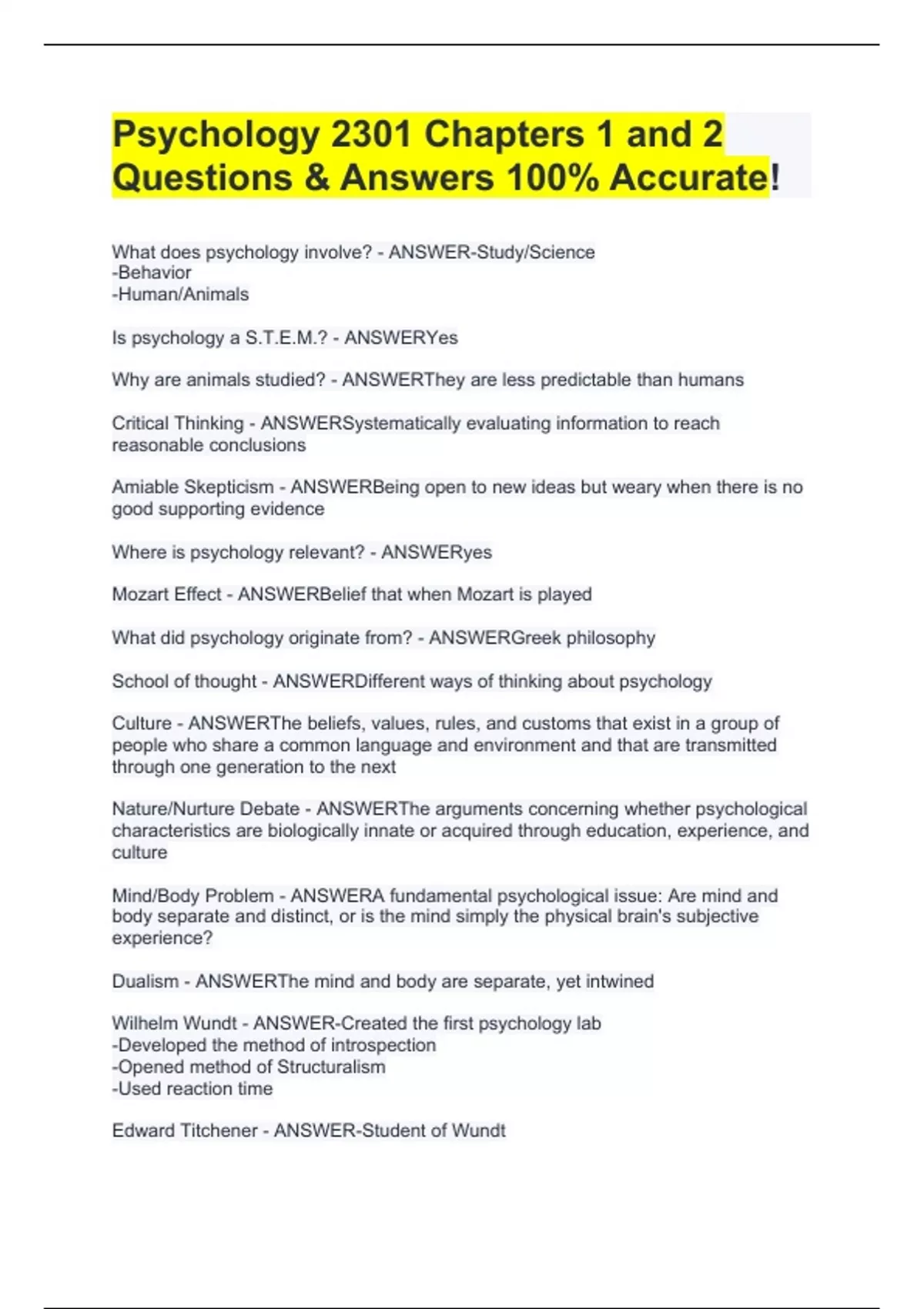 Psychology 2301 Chapters 1 and 2 Questions & Answers 100% Accurate!
