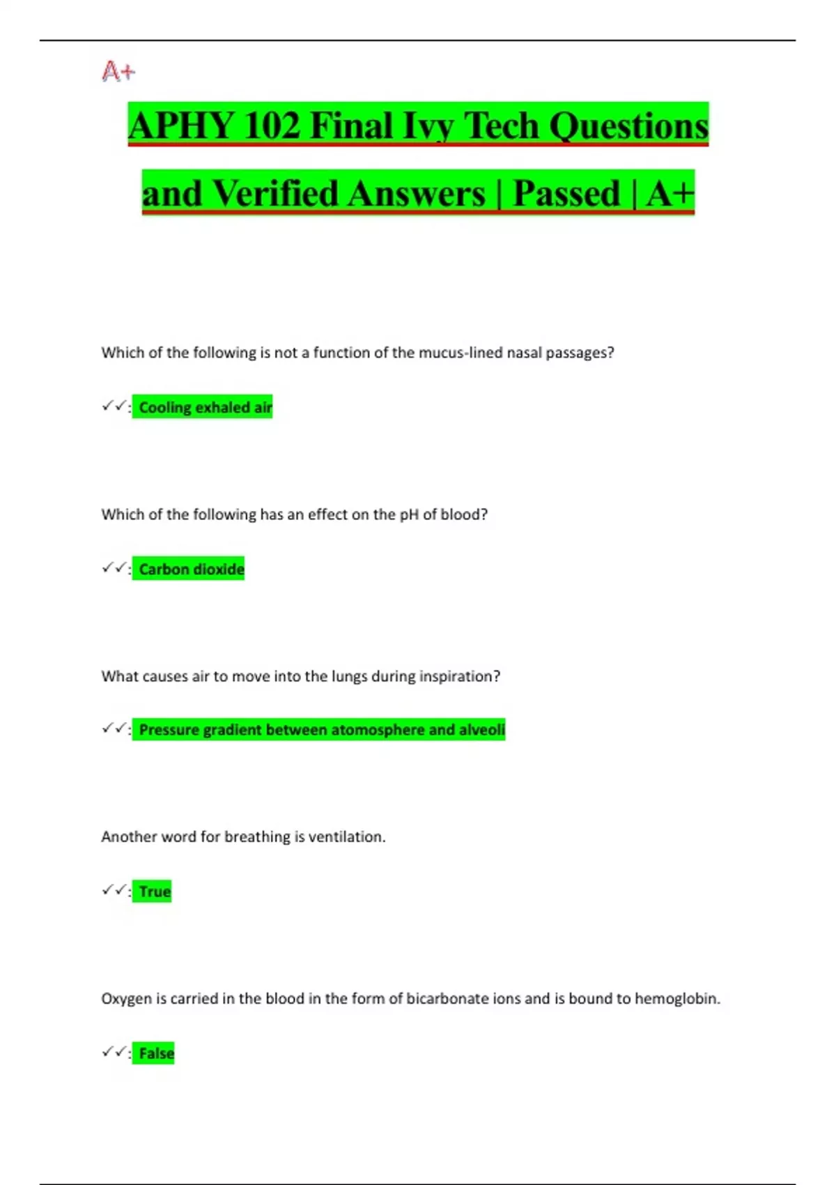 APHY 102 Final Ivy Tech Questions and Verified Answers | Passed | A+