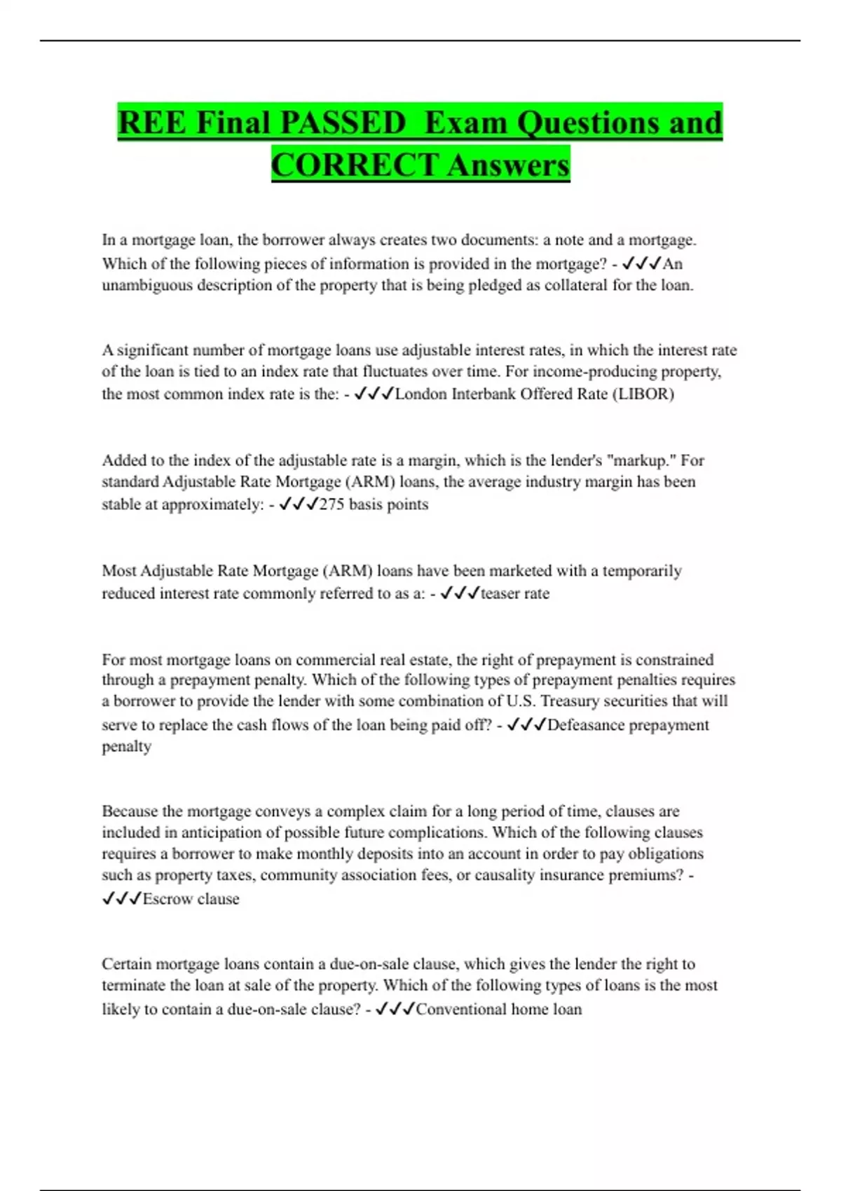 In a mortgage loan, the borrower always creates two documents: a note and a mortgage. Which of the following pieces of information is provided in the mortgage? - An unambiguous description of the property that is being pledged as collateral for the loan. A significant number of mortgage loans use adjustable interest rates, in which the interest rate of the loan is tied to an index rate that fluctuates over time. For income-producing property, the most common index rate is the: - London Interbank Offered Rate (LIBOR) Added to the index of the adjustable rate is a margin, which is the lender's "markup." For standard Adjustable Rate Mortgage (ARM) loans, the average industry margin has been stable at approximately: - 275 basis points Most Adjustable Rate Mortgage (ARM) loans have been marketed with a temporarily reduced interest rate commonly referred to as a: - teaser rate