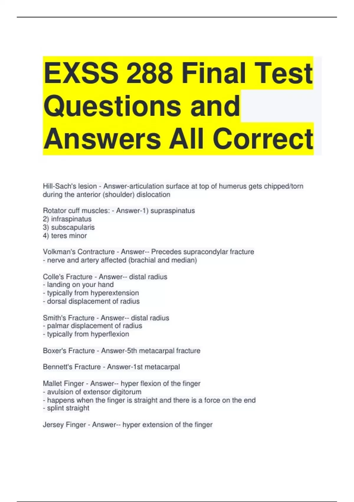 EXSS 288 Final Test Questions and Answers All Correct Hill-Sach's lesion - Answer-articulation surface at top of humerus gets chipped/torn during the anterior (shoulder) dislocation Rotator cuff muscles: - Answer-1) supraspinatus 2) infraspinatus 3) subscapularis 4) teres minor Volkman's Contracture - Answer-- Precedes supracondylar fracture - nerve and artery affected (brachial and median) Colle's Fracture - Answer-- distal radius - landing on your hand - typically from hyperextension - dorsal displacement of radius Smith's Fracture - Answer-- distal radius - palmar displacement of radius - typically from hyperflexion Boxer's Fracture - Answer-5th metacarpal fracture Bennett's Fracture - Answer-1st metacarpal Mallet Finger - Answer-- hyper flexion of the finger - avulsion of extensor digitorum - happens when the finger is straight and there is a force on the end - splint straight Jersey Finger - Answer-- hyper extension of the finger - avulsion of flexor digitorum profundus - happens when finger is caught on a jersey - curved splint Jammed Finger - Answer-PIP and DIP joints Gamekeeper/Skier's Thumb - Answer-MP joint of thumb - landing with your thumb and pointer finger far away from each other Subungual Hematoma - Answer-- Bleeding underneath the nail bed - Pressure causes pain Cyclist's Palsy - Answer-- compression of the ulnar nerve - bicyclist's palms on the handles - pinky and half the ring finger can go tingly Medical emergencies - Answer-- lung injuries - cardiac tamponade - heat stroke lung injuries - Answer-- pneumothorax - hemothorax - tension pneumothorax Liver contusion referred pain - Answer-referred pain: just below the right scapula Kidney contusion referred pain - Answer-referred pain: radiates forward around the trunk into the lower abdominal region Spleen referred pain (Kehr's sign = heart attack) - Answer-left shoulder, upper 1/3 of arm Costochondral separation referred pain - Answer-pain at the costochondral junction URQ - Answer-right lobe of liver gallbladder right kidney portions of stomach, small and large intestine ULQ - Answer-left lobe of liver stomach pancreas spleen left kidney portions of large intestine LRQ - Answer-cecum appendix portions of small intestine reproductive organs right ureter LLQ - Answer-small intestine portions of large intestine left ureter reproductive organs Assessing movements: - Answer-- Wiggle toes - Plantarflex and dorsiflex ankles - Flex and extend knees and hips - Deep inhale and exhale - Wiggle fingers - Flex and extend wrists - Flex and extend elbows - Shrug shoulders - Rotate chin toward left and right shoulders - Flex head toward right and left shoulders McBurney's Point - Answer-1/2 way b/w belly button and LRQ where most cramps occur appendix location - appendix referred pain "Stitch in side" - Answer-cramp-like pain developing along costal angle during activity True ribs - Answer-1-7 False ribs - Answer-8-10 Floating ribs - Answer-11-12 most commonly injured organs: - Answer-kidneys & spleen Care for fracture: - Answer-- splint, swathe, innervation (wiggle fingers, palpation) - circulation (temperature, color, capillary refill, pulse) Care for cervical fracture: - Answer-- treat like an unconscious victim - check for pulse and breathing - stabilize and prevent further movement - keep head in position found - keep person calm - spine board - 911 Two ways to get concussed: - Answer-- direct blow - transmittal forces When you have unconscious players, assume: - Answer-cervical spine injury Battle's sign - Answer-discoloration of skin behind the ear Always apply to something bleeding. - Answer-pressure Care for: skull fracture - Answer-- immediate hospitalization and referral to neurosurgeon - stabilize them Care for: scalp injuries - Answer-- clean w antiseptic soap and water - remove debris - cut away and hair if necessary to expose area - apply pressure - wounds larger than 1/2 inch should be referred Care for: mandible fracture - Answer-- Immobilization w elastic wrap followed by reduction and fixation - ace bandage w flexibility so they could spit out any blood - lay them on back Care for: temporomandibular dislocation - Answer-- Send to ER for reduction - Wire shut