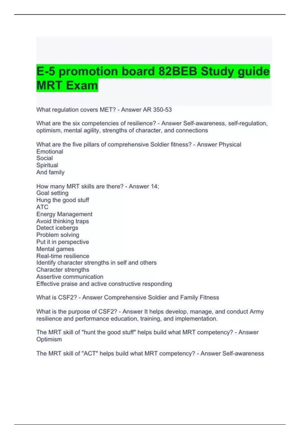 E-5 promotion board 82BEB Study guide MRT Exam Questions and Answers