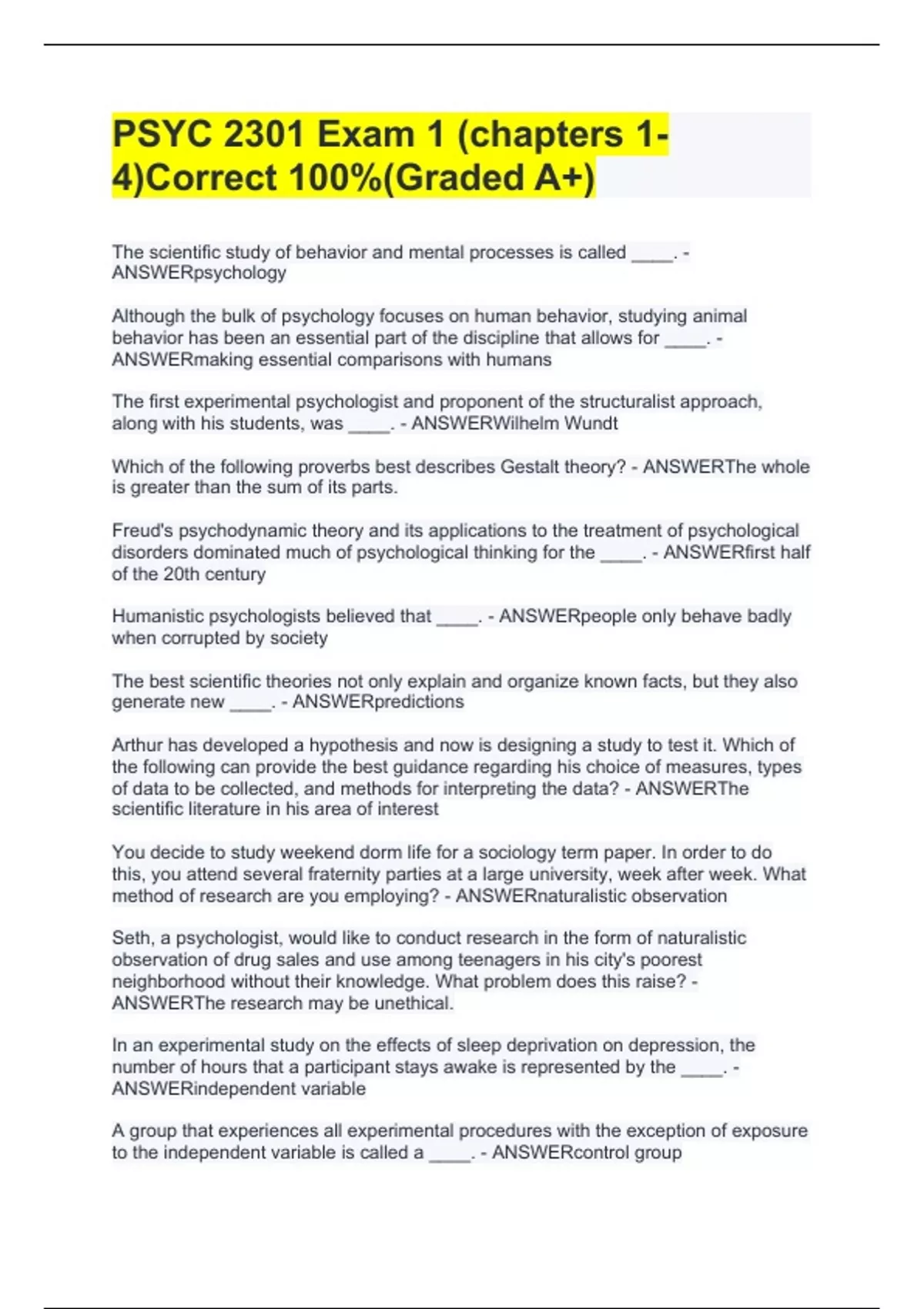 PSYC 2301 Exam 1 (chapters 1-4)Correct 100%(Graded A+)