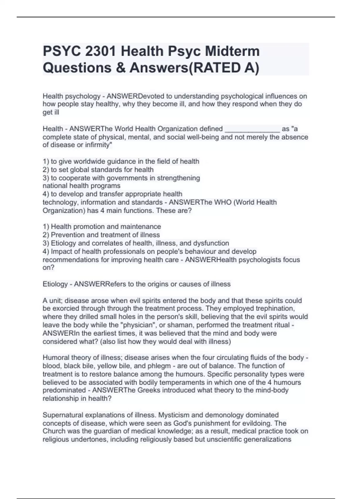 Health psychology - ANSWERDevoted to understanding psychological influences on how people stay healthy, why they become ill, and how they respond when they do get ill Health - ANSWERThe World Health Organization defined ______________ as "a complete state of physical, mental, and social well-being and not merely the absence of disease or infirmity" 1) to give worldwide guidance in the field of health 2) to set global standards for health 3) to cooperate with governments in strengthening national health programs 4) to develop and transfer appropriate health technology, information and standards - ANSWERThe WHO (World Health Organization) has 4 main functions. These are? 1) Health promotion and maintenance 2) Prevention and treatment of illness 3) Etiology and correlates of health, illness, and dysfunction 4) Impact of health professionals on people's behaviour and develop recommendations for improving health care - ANSWERHealth psychologists focus on? Etiology - ANSWERRefers to the origins or causes of illness A unit; disease arose when evil spirits entered the body and that these spirits could be exorcied through through the treatment process. They employed trephination, where they drilled small holes in the person's skill, believing that the evil spirits would leave the body while the "physician", or shaman, performed the treatment ritual - ANSWERIn the earliest times, it was believed that the mind and body were considered what? (also list how they would deal with illness) Humoral theory of illness; disease arises when the four circulating fluids of the body - blood, black bile, yellow bile, and phlegm - are out of balance. The function of treatment is to restore balance among the humours. Specific personality types were believed to be associated with bodily temperaments in which one of the 4 humours predominated - ANSWERThe Greeks introduced what theory to the mind-body relatio
